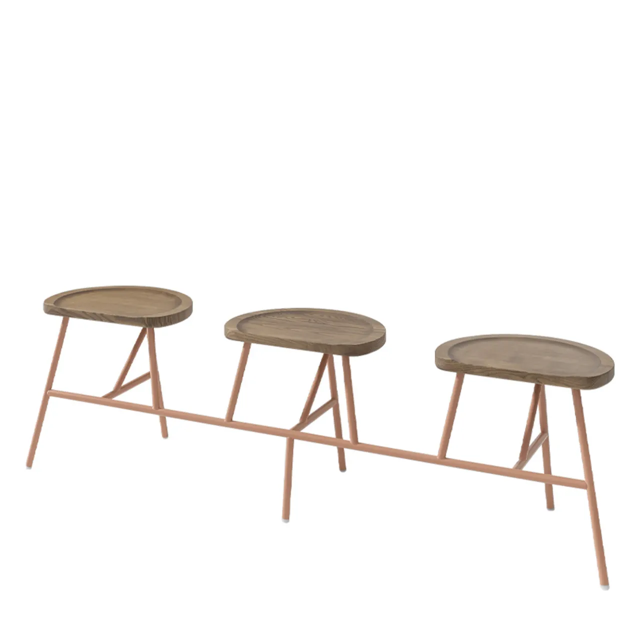 Questo esclusivo progetto di Emilio Nanni, che trasmette un senso di leggerezza e fascino senza sforzo, trae ispirazione dallo sgabello e lo reinterpreta in molteplici versioni che si integrano con gli arredi commerciali e residenziali. La struttura cilindrica in acciaio laccato in tonalità tabacco chiaro sostiene con grazia le tre sedute separate, ciascuna di forma semicircolare e realizzate in frassino tinto in marrone mogano.