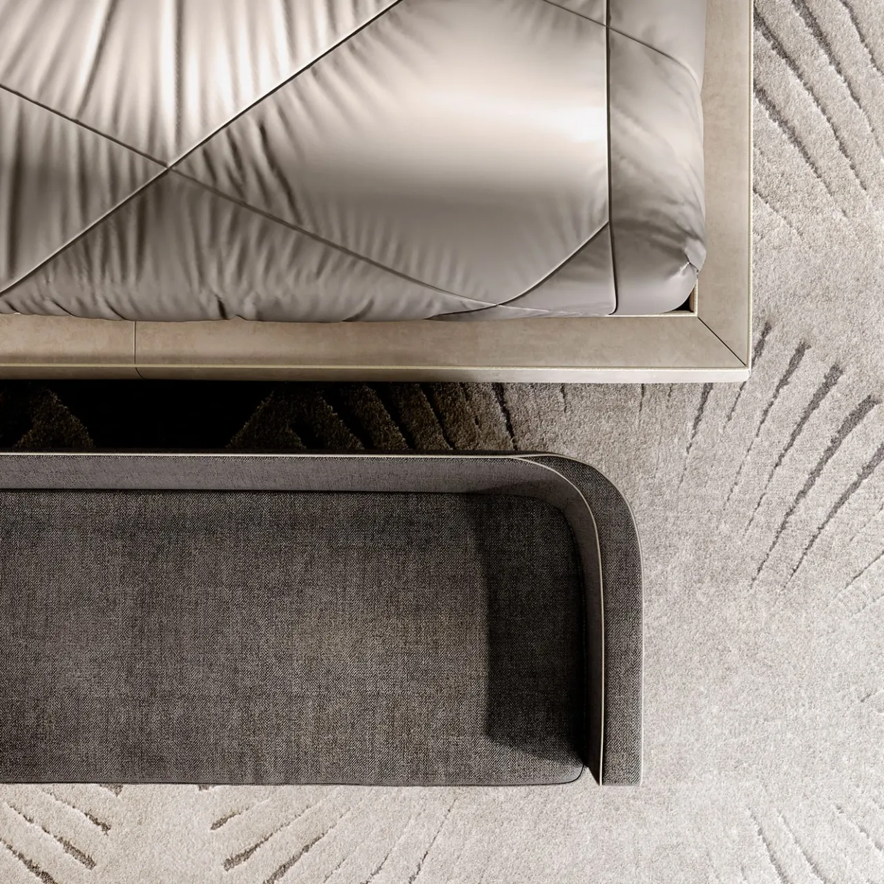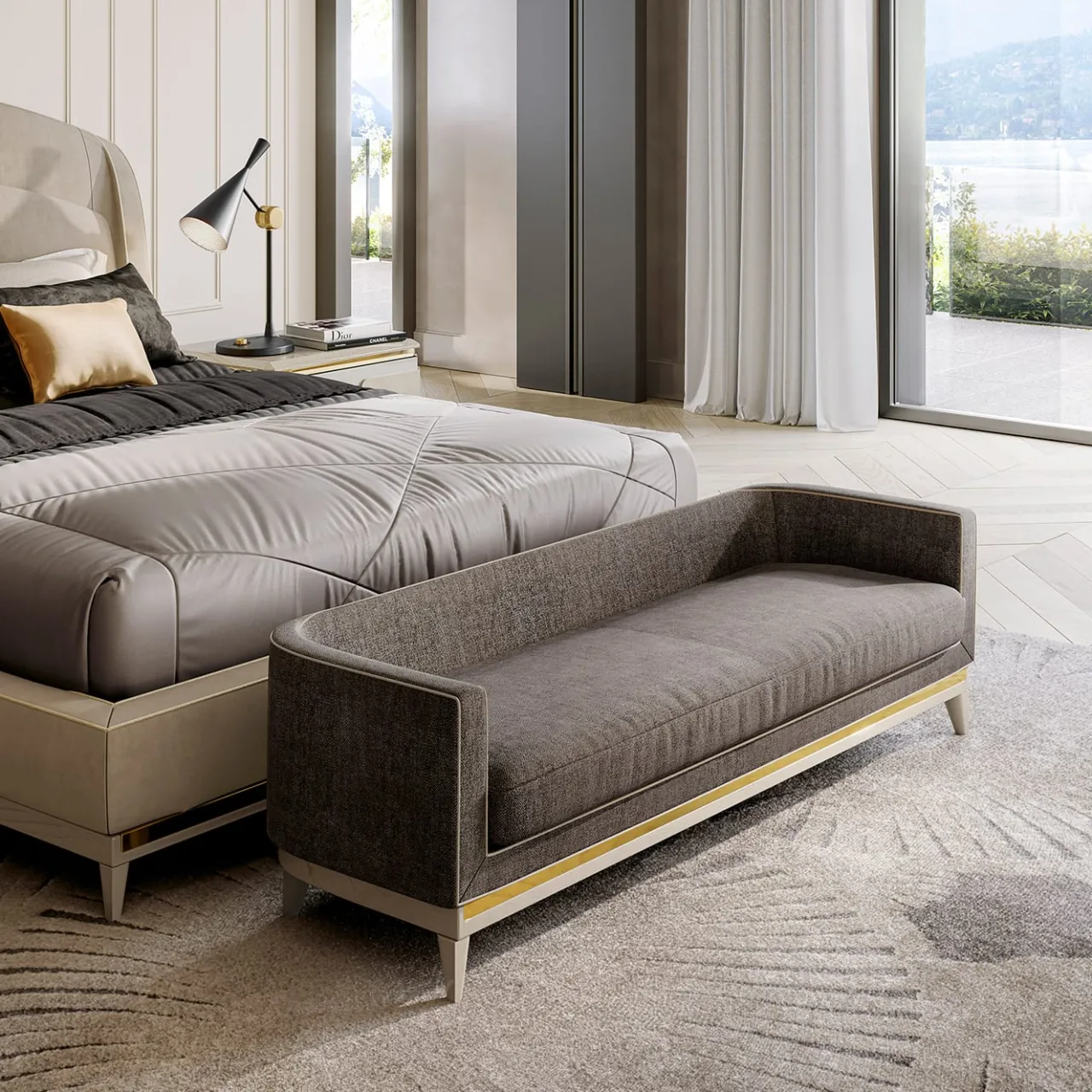Originale e inaspettata, questa panca, dal design pulito e lineare, emana un carattere sofisticato e raffinato per una camera da letto o un ingresso. Contraddistinta da un profilo in metallo lucido, è interamente rivestita con uno squisito tessuto grigio. Per ulteriori dettagli, consultare il Concierge.