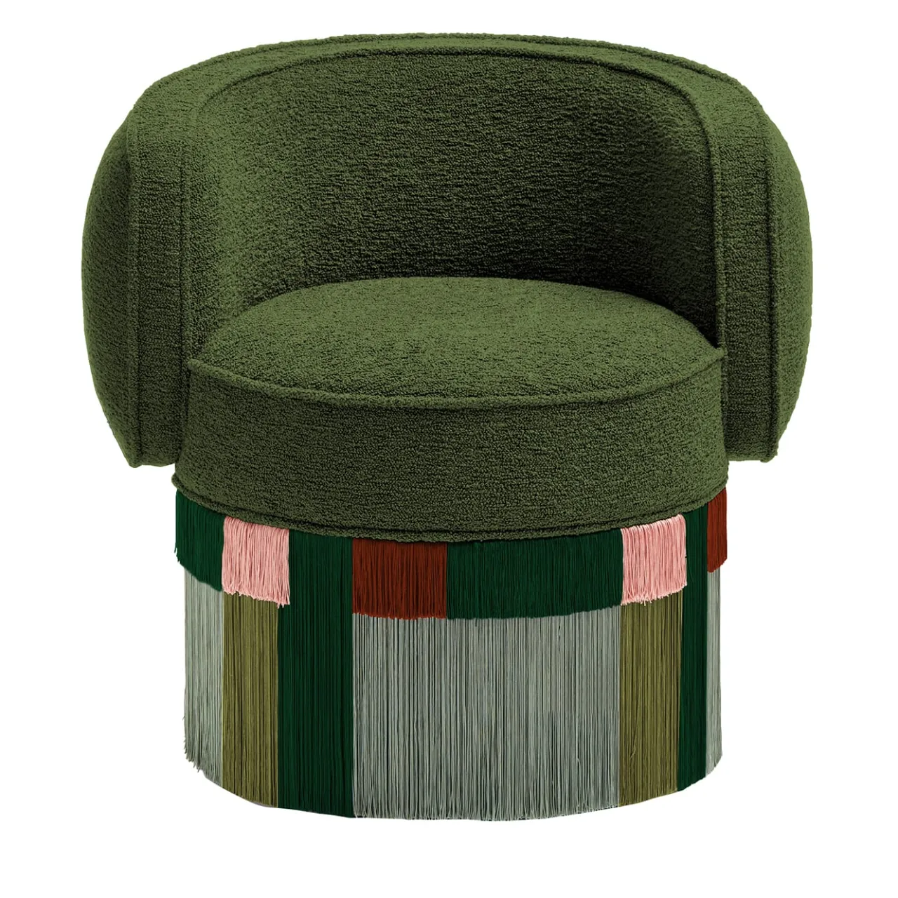 Una rivisitazione unica di una sedia classica, Pirouette Clu di Lorenza Bozzoli è completamente realizzata a mano e presenta una raffinata sedia a vasca imbottita verde oliva impreziosita da un sorprendente disegno geometrico e da una gonna a frange in viscosa lunga fino al pavimento in splendide tonalità di verde, ruggine e rosa. Da abbinare ad altri pezzi della stessa collezione. Le personalizzazioni dei colori sono disponibili su richiesta al Concierge.