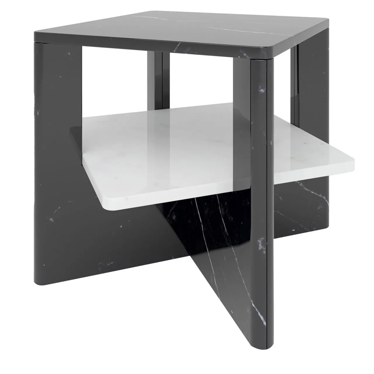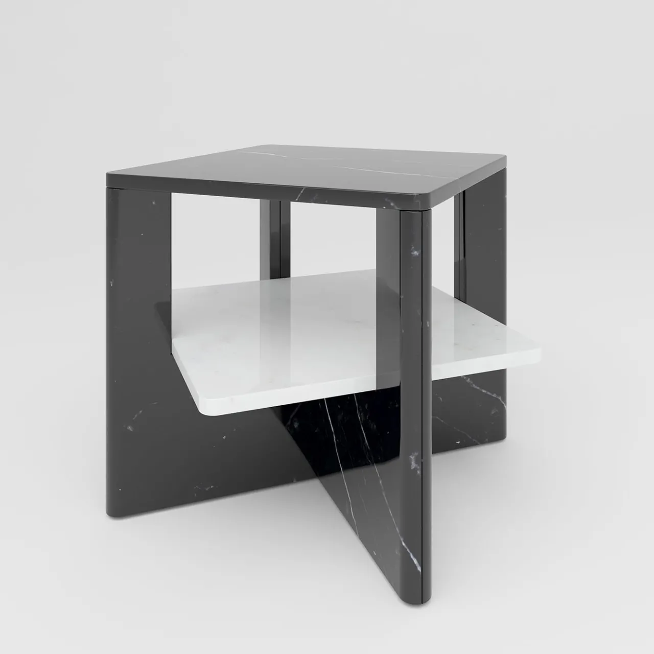 Disegnato in esclusiva da Antonio Saporito e ricavato da un lussuoso marmo, questo elegante tavolino creerà un notevole effetto cromatico e spaziale in un sofisticato interno contemporaneo. Le due lastre di marmo nero a U intersecate che sostengono il piano del tavolo e il ripiano inferiore bianco a contrasto, le superbe venature naturali di queste pietre pregiate sono impreziosite da una finitura lucidata a mano.