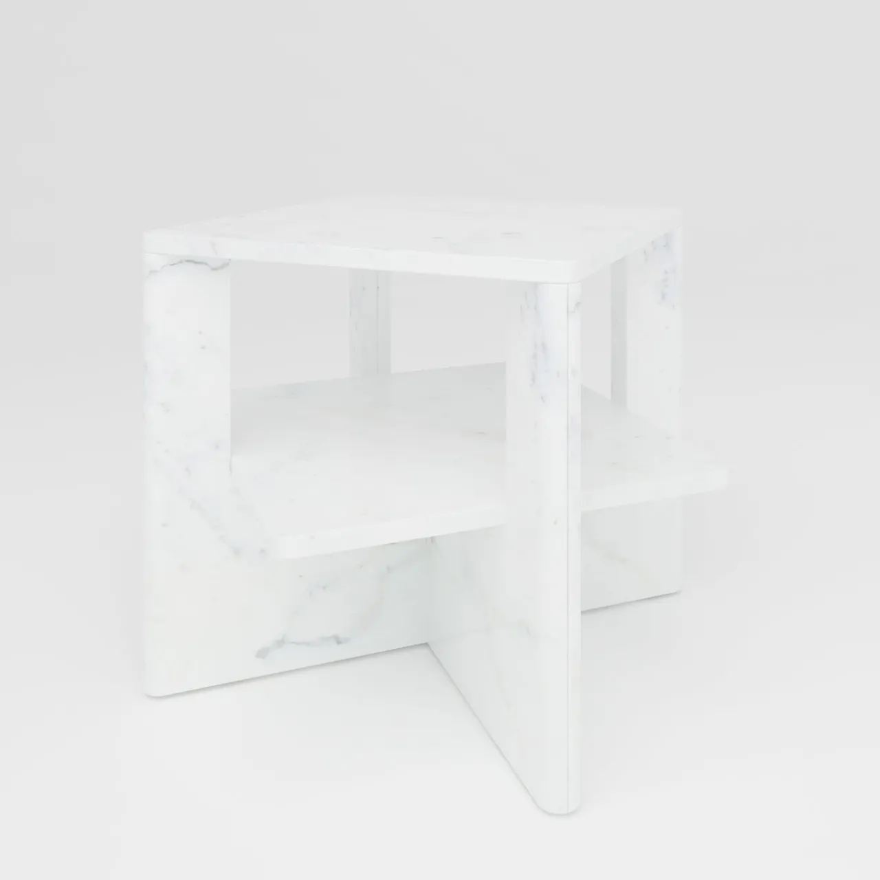 Da inserire in un ambiente tradizionale o contemporaneo, questo tavolino in marmo bianco superbamente scolpito dal designer Antonio Saporito darà un tocco di raffinatezza con la sua sobria eleganza e le sue linee pulite. Le due gambe a U che si intersecano e che sostengono il ripiano superiore e quello inferiore creano un effetto spaziale unico e dinamico di pieni e vuoti. Completa il tutto una finitura lucidata a mano che mette in risalto le venature naturali della pietra.