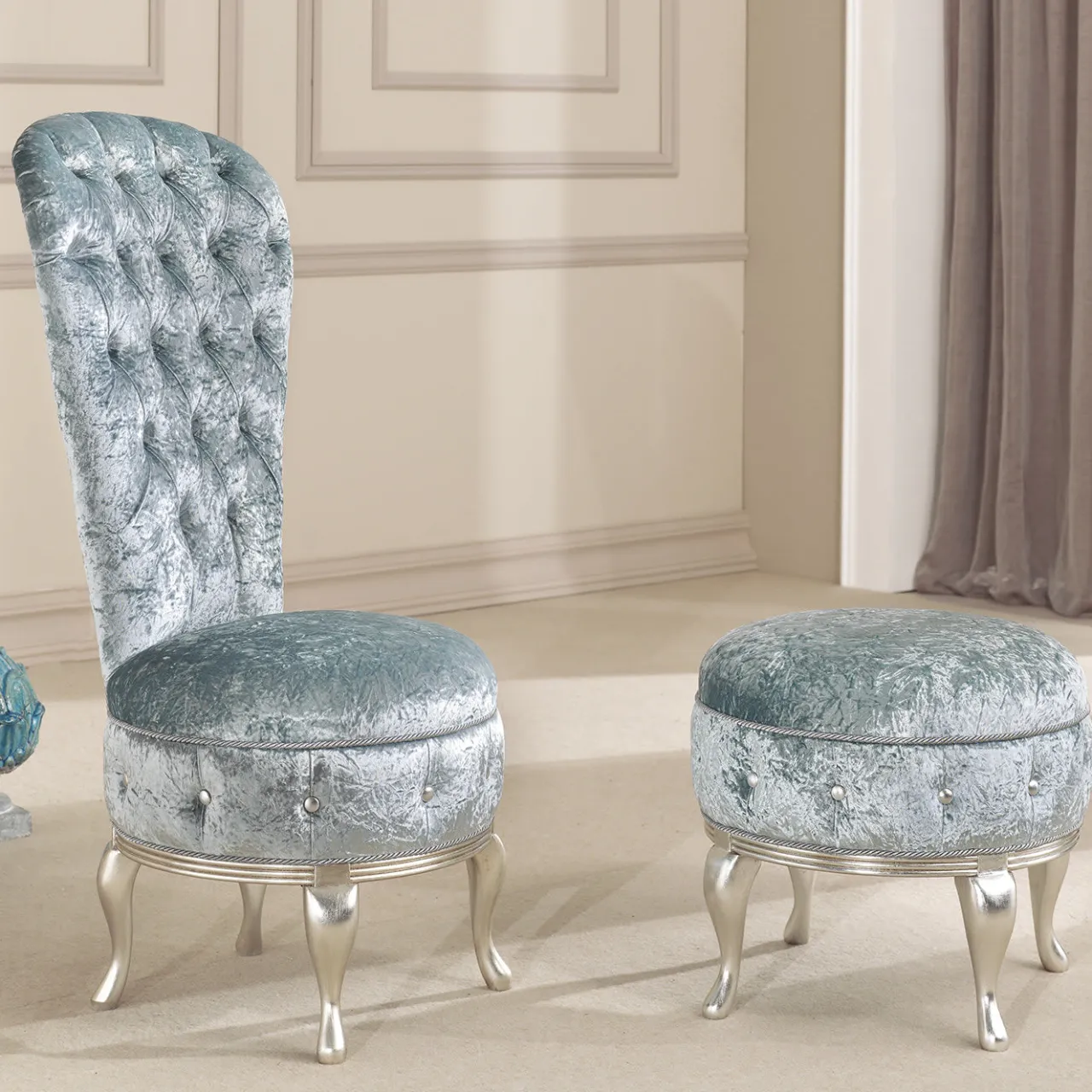 Ispirato all’estetica mediorientale e allo stile occidentale contemporaneo, il poggiapiedi Aladino è un’aggiunta affascinante e invitante a un salotto o a un soggiorno. Caratterizzato da una scintillante finitura a foglia d’argento, il poggiapiedi è rivestito in velluto blu Tiffany e arricchito da bottoni in ecopelle. Il poggiapiedi è realizzato a mano da abili artigiani del Veneto.