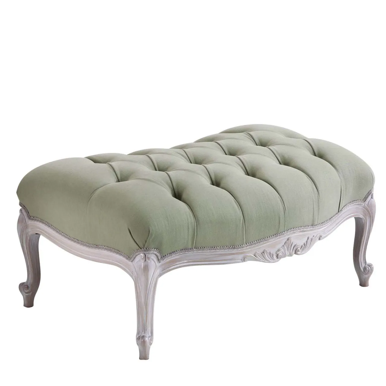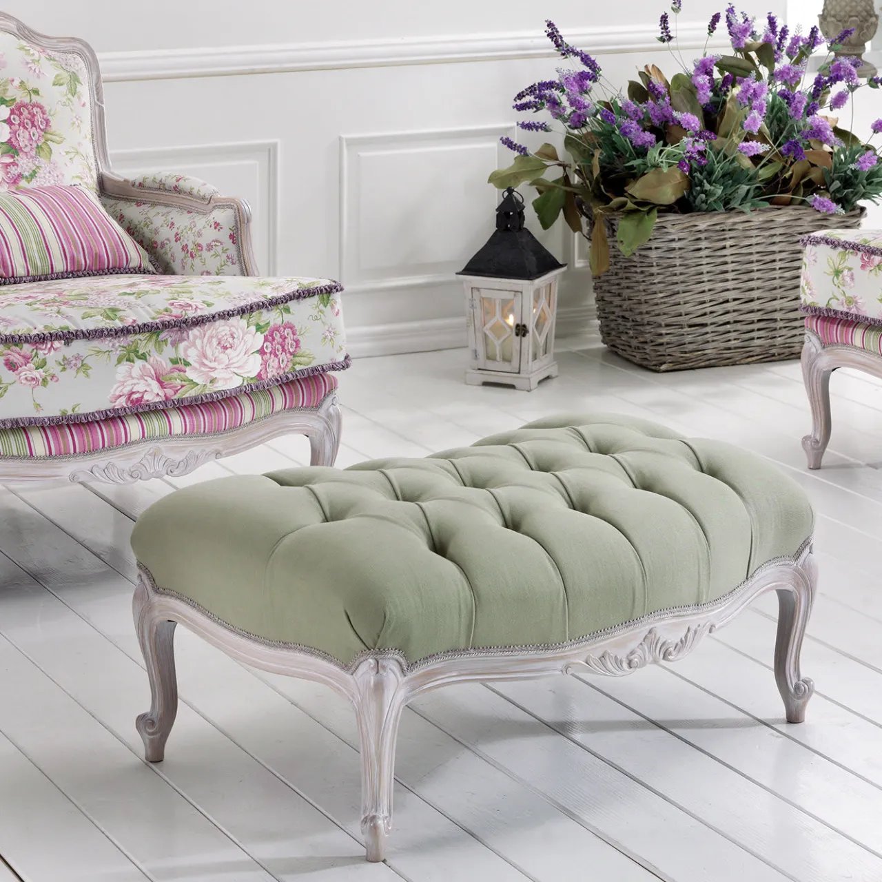 Combinando il meglio della tradizione francese e del know-how italiano, il poggiapiedi Provenzale è realizzato a mano in Veneto, regione nota per i suoi arredi. Su una base intricatamente intagliata con finitura decapè per un effetto invecchiato, il poggiapiedi è rivestito in tessuto verde chiaro e completato da bottoni a righe gialle e fucsia con effetto capitonnè.