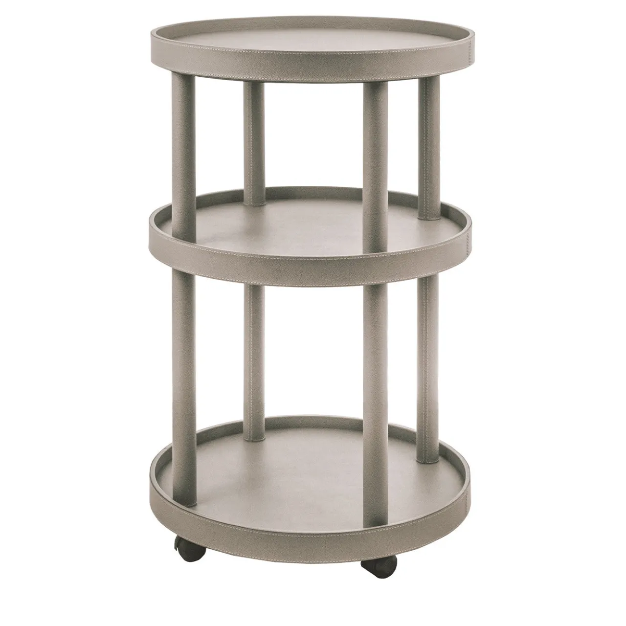 Questo tavolo rotondo, semplice ed elegante, fa parte della collezione Polo e vanta tre ripiani con bordi rialzati e morbidi e una struttura in legno interamente rivestita in pelle color tortora. Perfettamente dimensionato per adattarsi a interni di piccole dimensioni, questo tavolo offre spazio extra per libri, ninnoli e oggetti decorativi, e può essere utilizzato come carrello da bar grazie al vassoio rimovibile del piano e alle ruote alla base.