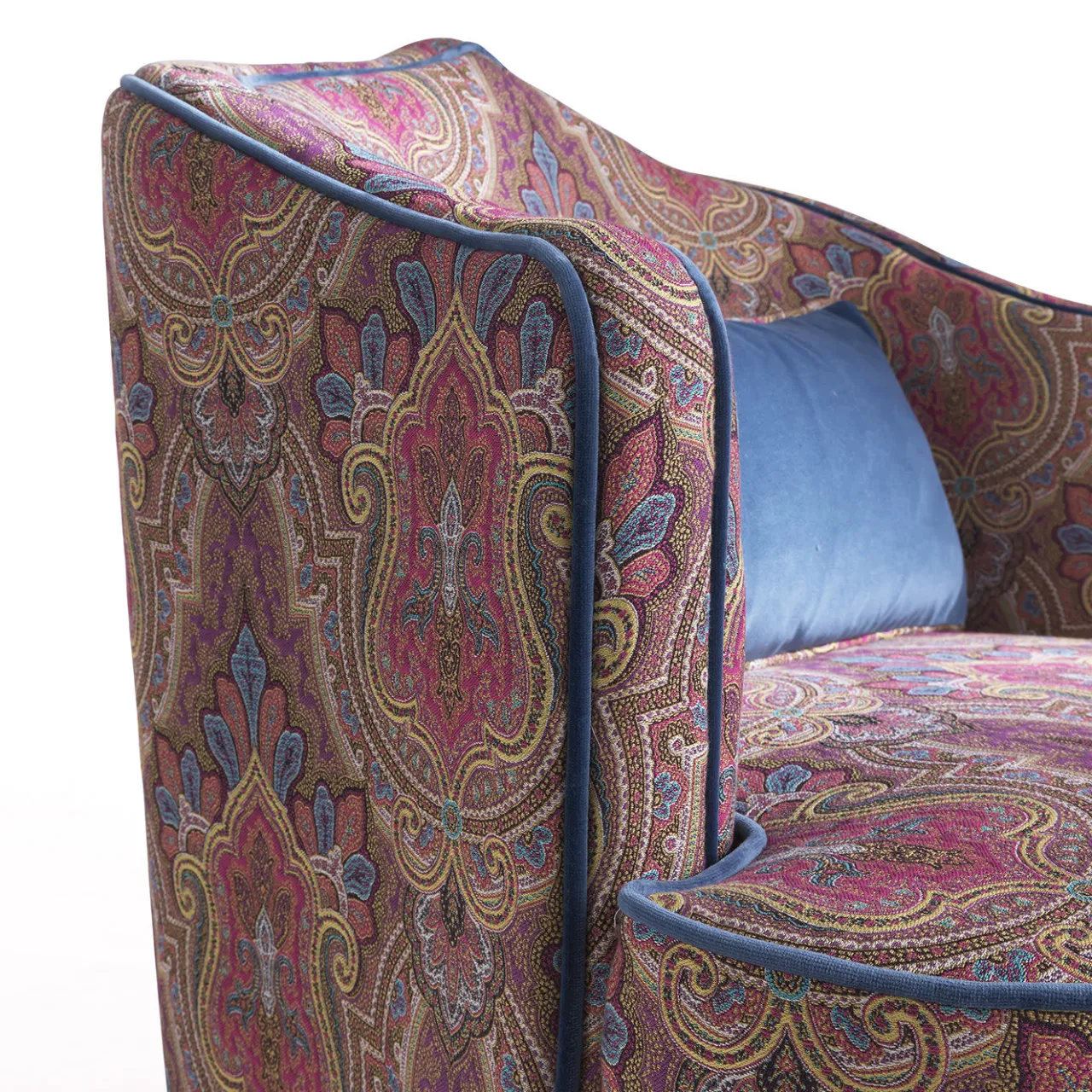 Una poltrona attraente e confortevole ispirata a un’immagine da “mille e una notte”. La combinazione di tessuti diversi e l’originale passamaneria multicolore contribuiscono a creare una poltrona originale, in perfetto stile Etro Home Interiors. Poltroncina con struttura in legno e schiuma rivestita in tessuto cat. A Deosai col. 2 Overdose. Piping in velluto cat. A Venezia col. 8 Baltic. Il fondo è in passamaneria multicolore. Set di cuscini incluso: 1 cuscino 50 x 35 cm in velluto cat. A Venezia col. 8 Baltic con bordino in tessuto cat. A Deosai col. 2 Overdose. Informarsi presso il Concierge per altri rivestimenti disponibili.