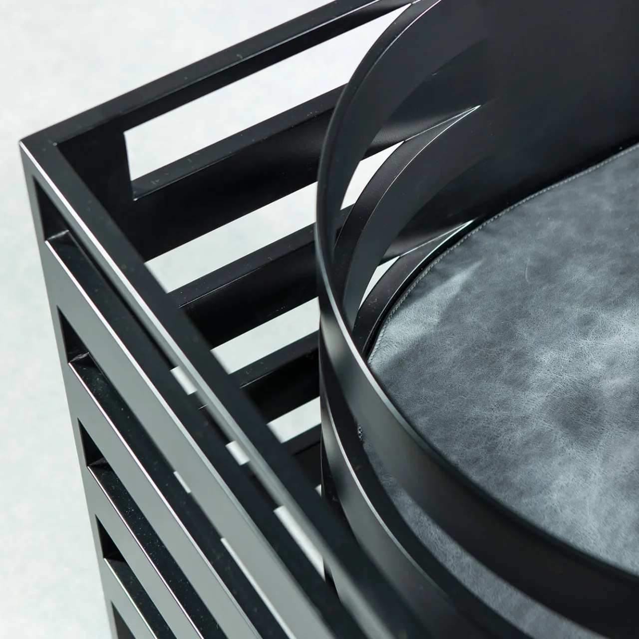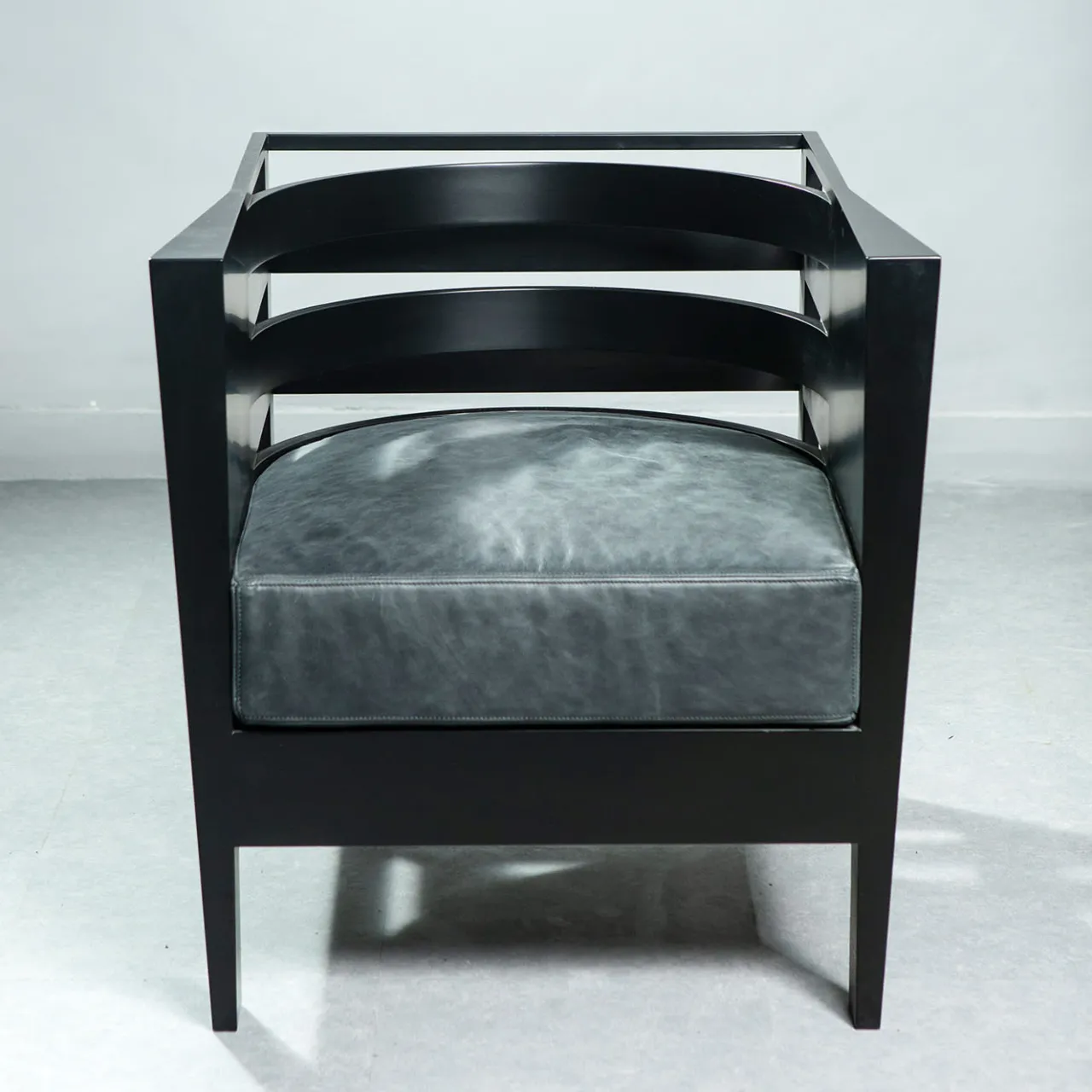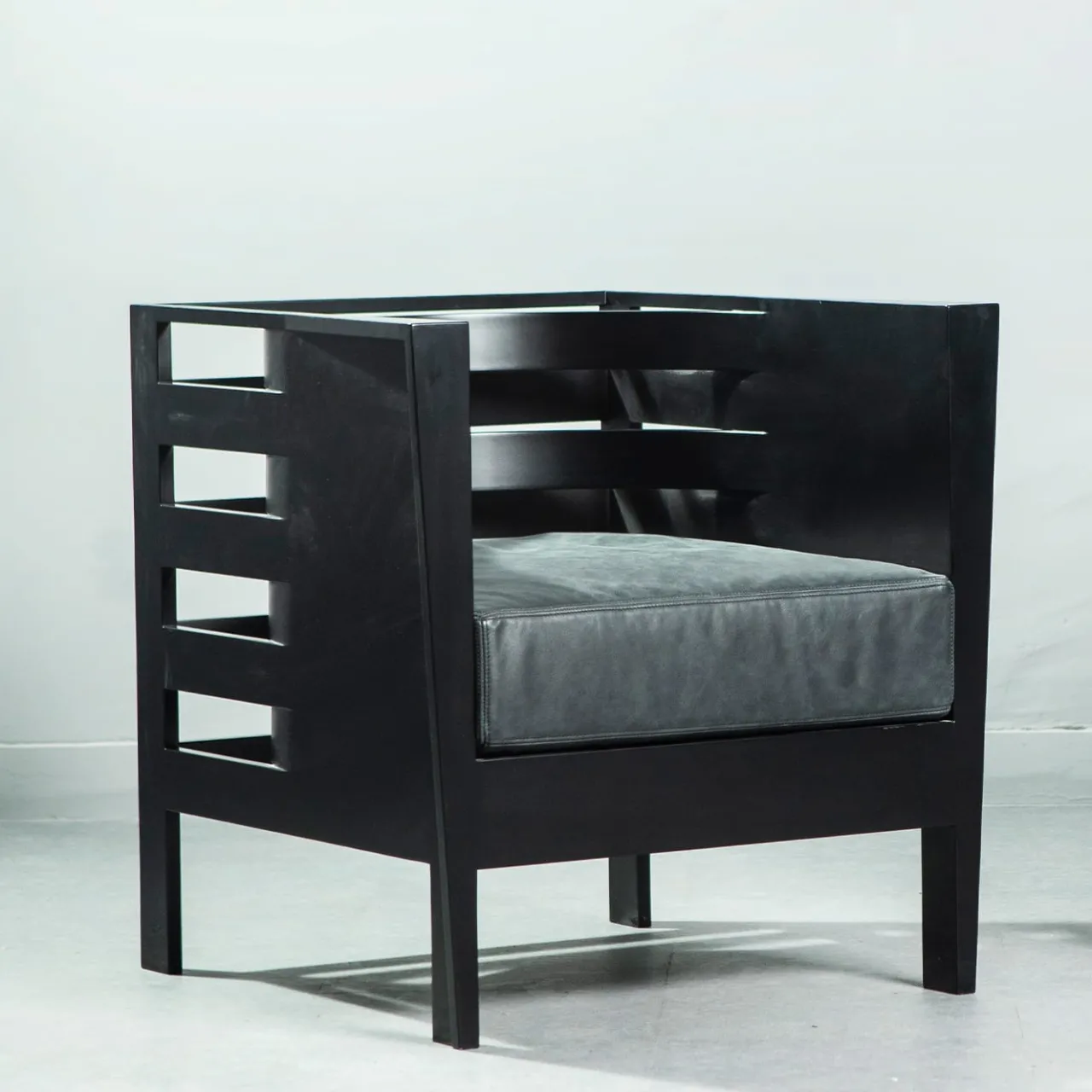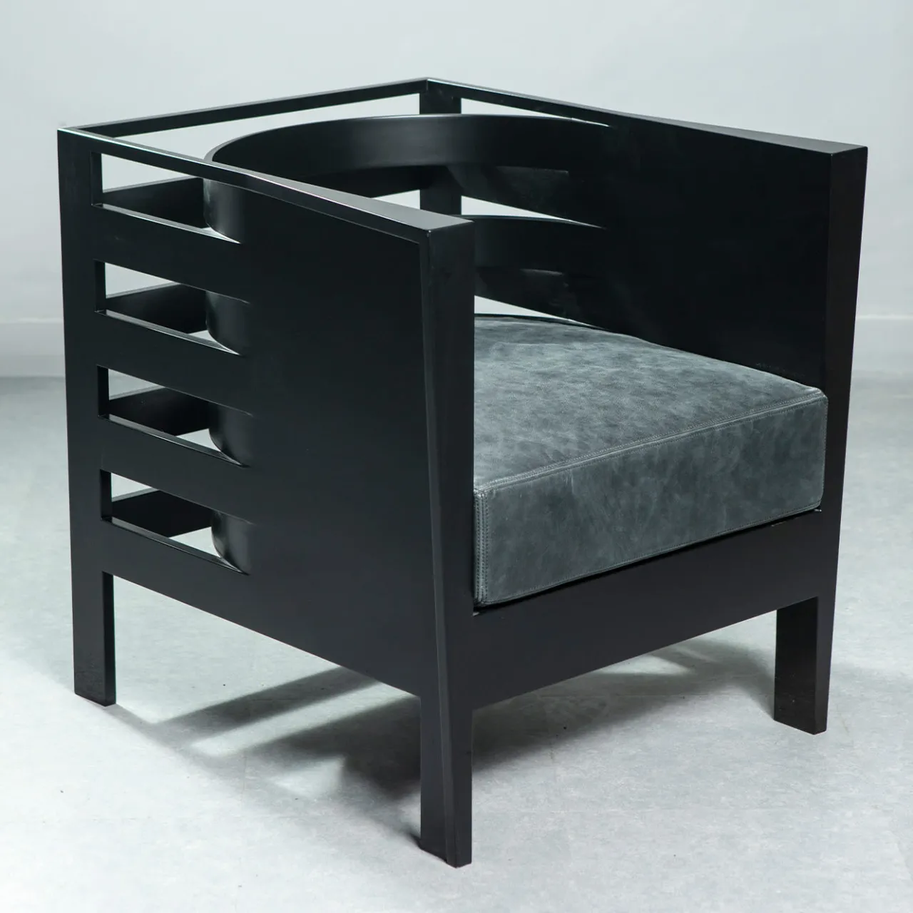 Caratterizzata da una struttura in faggio evaporato con finitura laccata nera opaca, la poltrona è completata da un elegante cuscino in ecopelle nera opaca. La combinazione di materiali resistenti e design elegante la rende una scelta perfetta per gli interni contemporanei.
