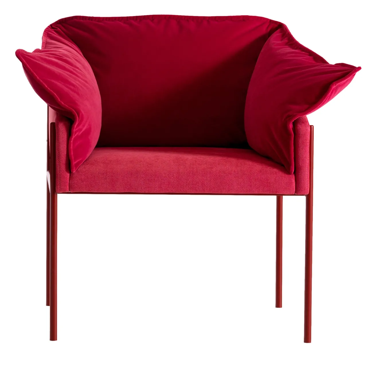 Design iconico e di forte impatto visivo, questa poltrona di Angeletti Ruzza è uno straordinario complemento per un interno moderno ed elegante. Le linee pulite e rette sono realizzate in metallo laccato rosso, così come la scocca in legno imbottita di poliuretano espanso e rivestita con un vivace tessuto rosso. Elementi distintivi di questo pezzo sono i braccioli e i cuscini dello schienale, imbottiti in fibra e piuma d’oca e rivestiti con lo stesso morbido tessuto della seduta.