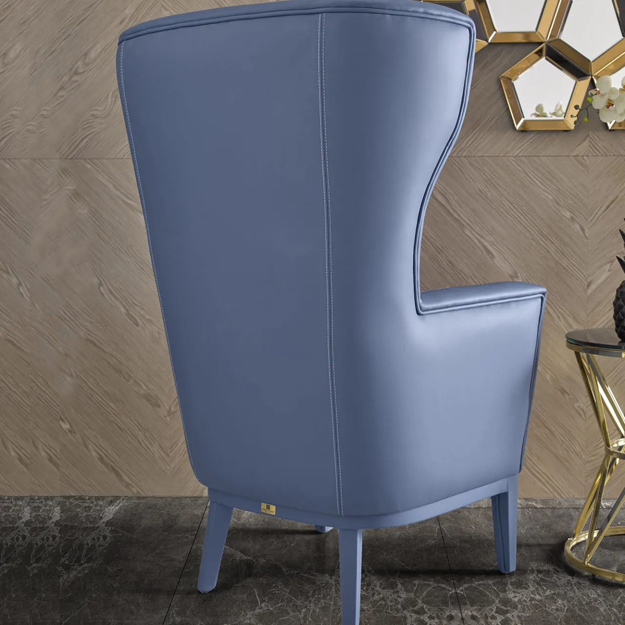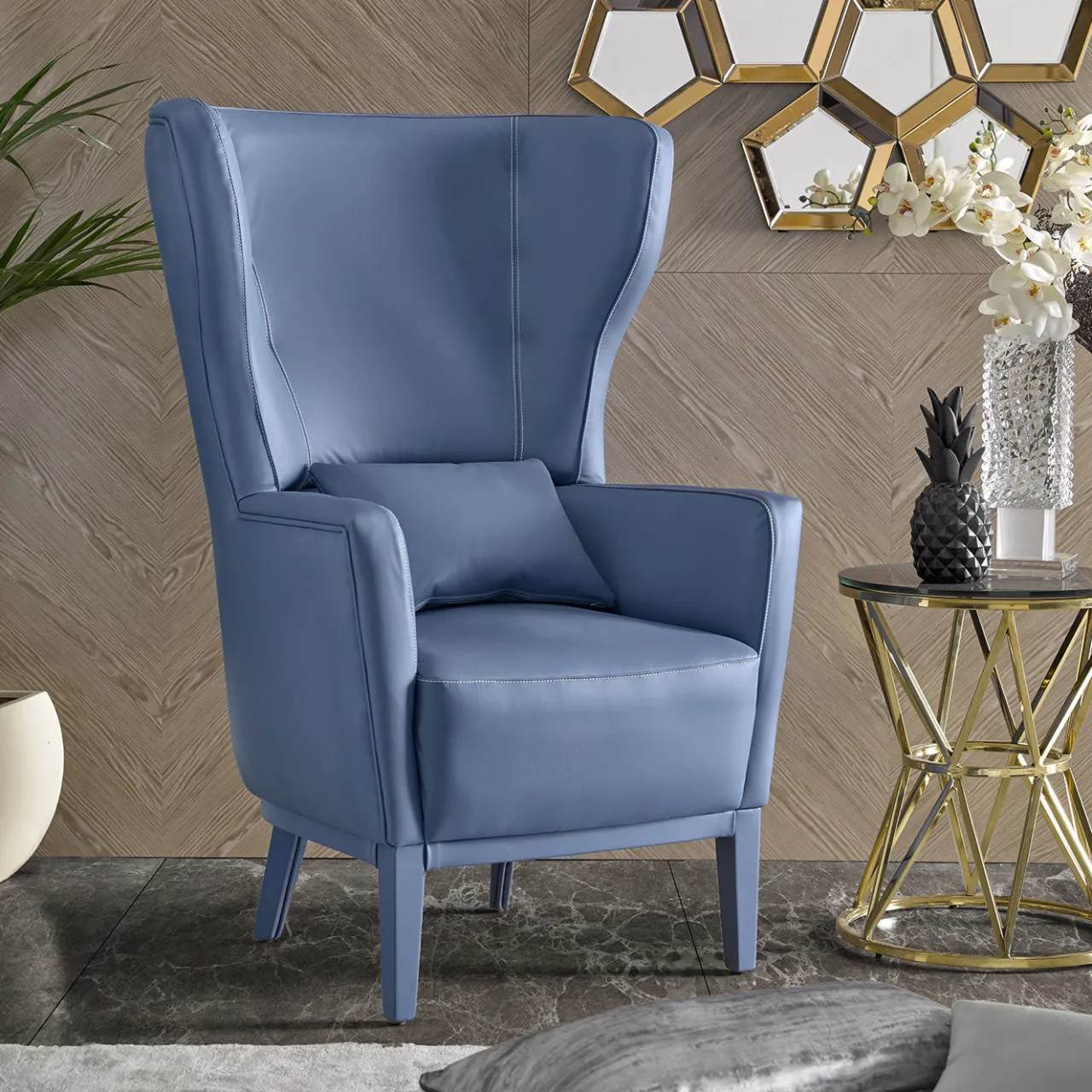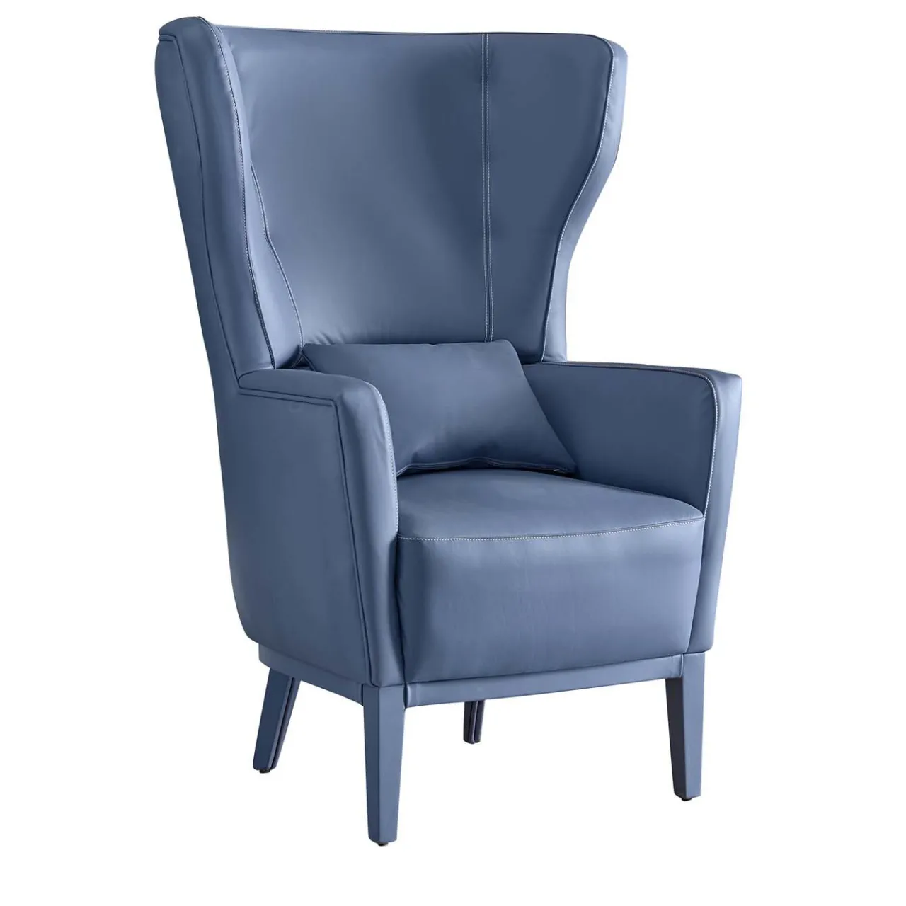 Un pezzo unico che aggiungerà un tocco moderno e di classe a qualsiasi casa o ufficio, questa poltrona wingback vanta uno schienale alto ed è interamente rivestita in pelle blu chiaro, comprese la base e le gambe. La poltrona è dotata di uno spesso cuscino di seduta e di un piccolo cuscino d’accento, anch’essi rivestiti nella stessa pelle.
