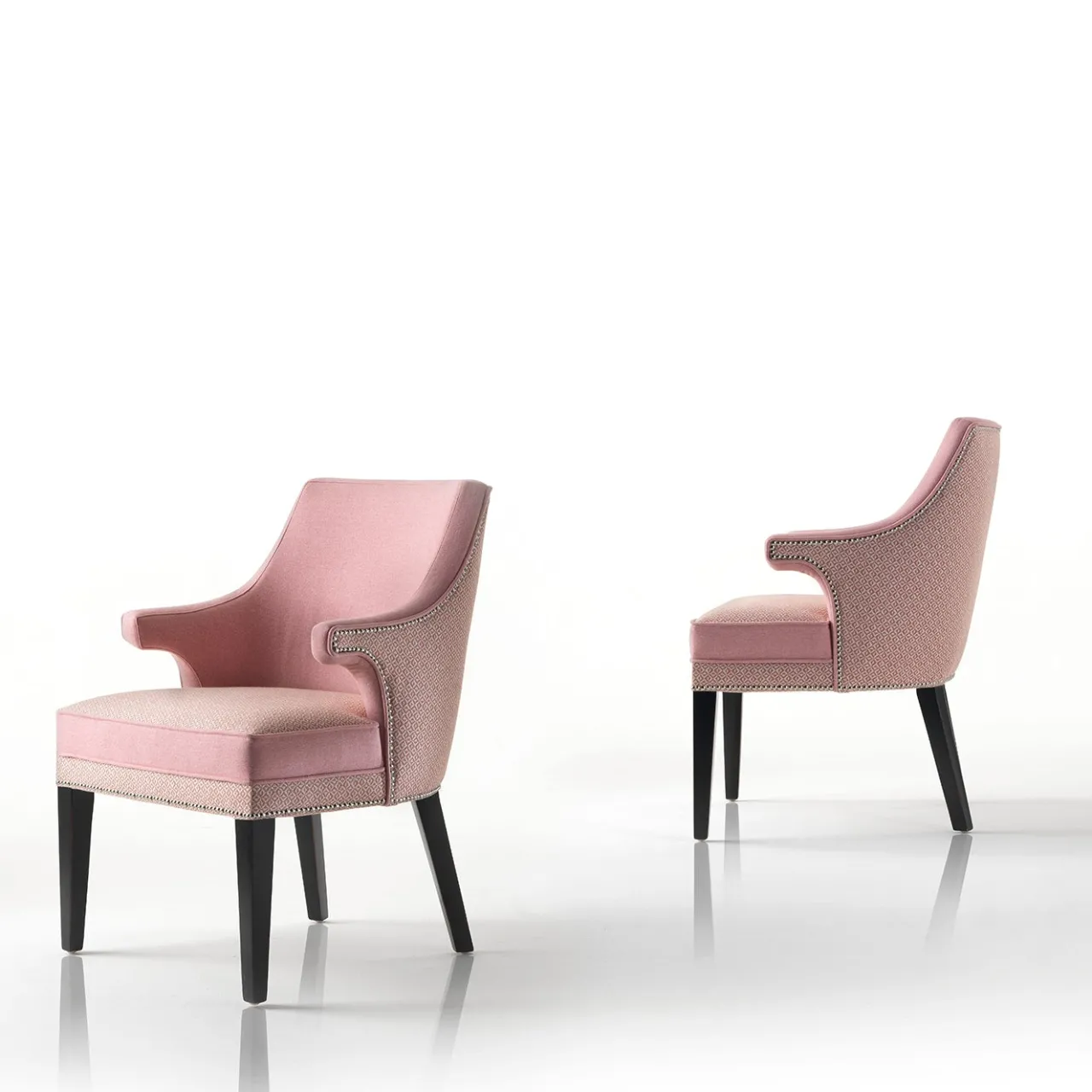 Un sofisticato motivo che evoca gli anni ’60 ha ispirato il romantico tessuto a fantasia che questa poltrona sfoggia all’esterno della scocca. La stessa scelta di stile è stata fatta per il morbido cuscino di seduta, ad eccezione della fascia perimetrale in velluto rosa che si abbina al rivestimento interno dello schienale e suggella la personalità femminile del progetto. Le borchie ornano i profili della sedia per un ulteriore tocco di eleganza sartoriale.