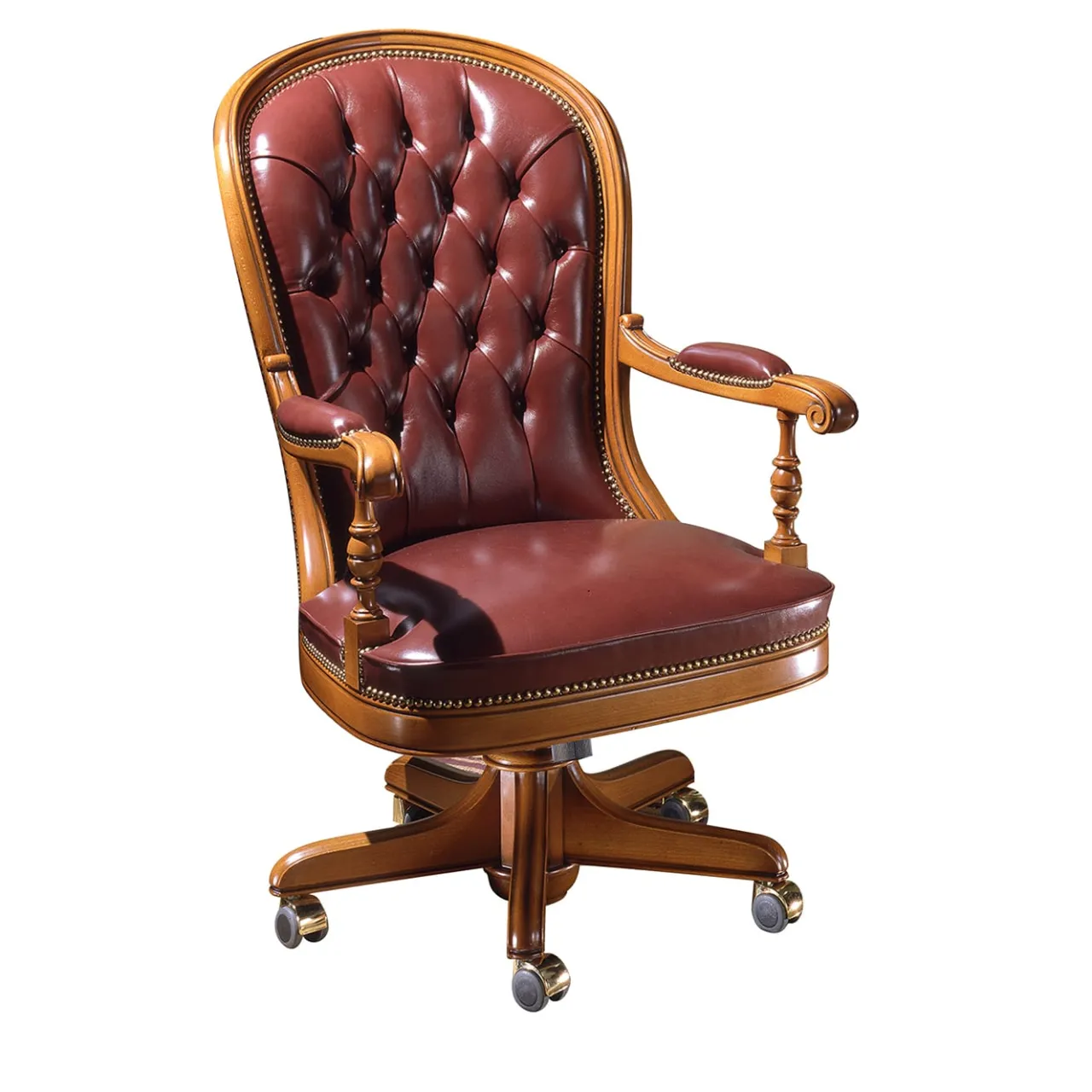 Poltrona girevole di lusso in stile classico con struttura in legno di faggio. L’altezza del sedile è regolabile e il meccanismo di oscillazione aiuta a mantenere una gamma completa di movimenti, bilanciando la postura. È imbottita con fettucce e schiuma di qualità superiore. Il rivestimento con bottoni profondi esalta particolarmente il lusso di questo modello e ne sottolinea il design avvolgente: la pelle di toro conciata riflette un’eleganza riservata. Sono disponibili altri colori di pelle, contattando il nostro Concierge.