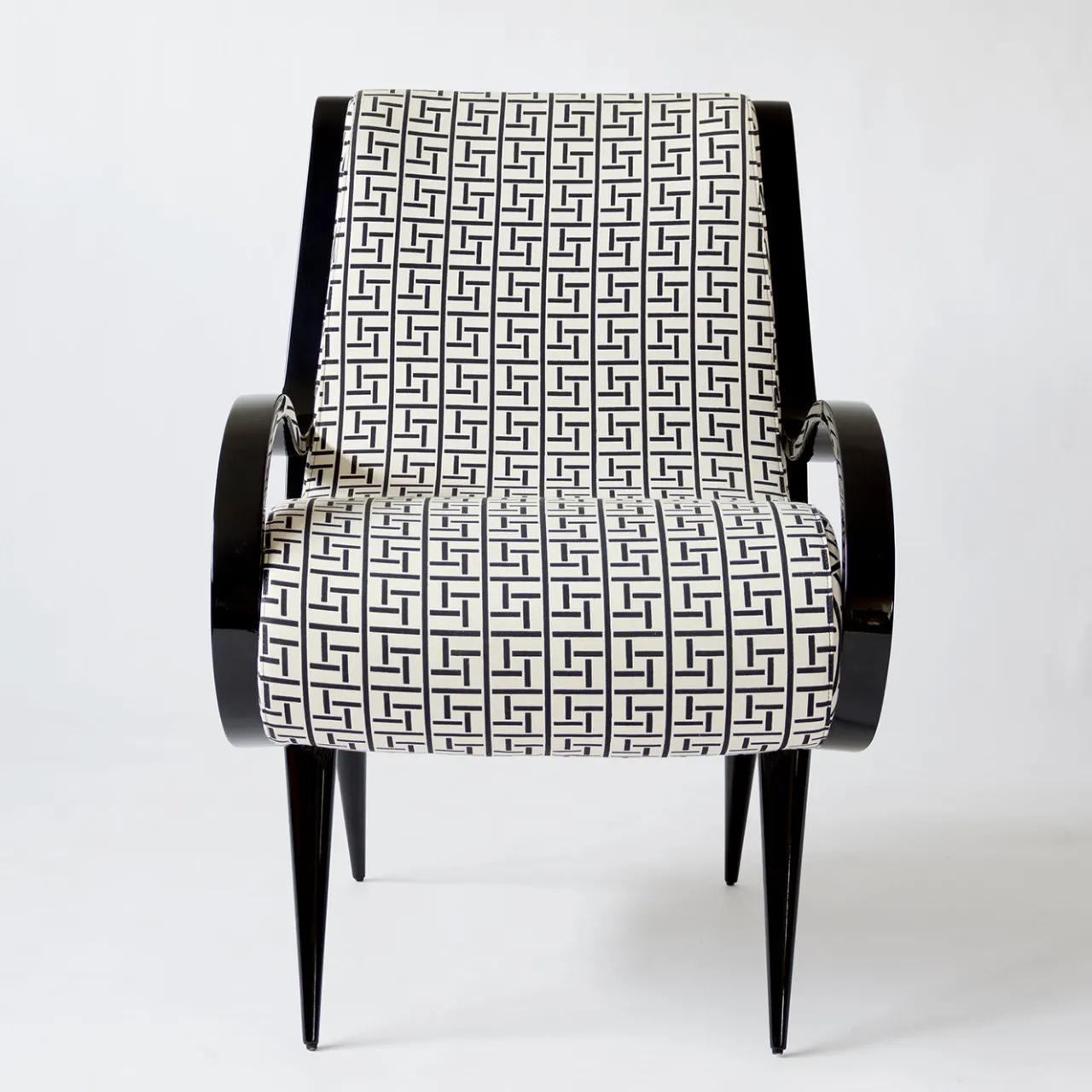 Look moderno e stile originale per questa poltrona di design. Il mobile ideale per aggiungere un tocco unico a qualsiasi salotto. Le gambe e gli originali braccioli arrotondati sono in legno laccato nero. Una finitura che si combina perfettamente con il tessuto grafico in bianco e nero. Un mix perfetto e sorprendente.