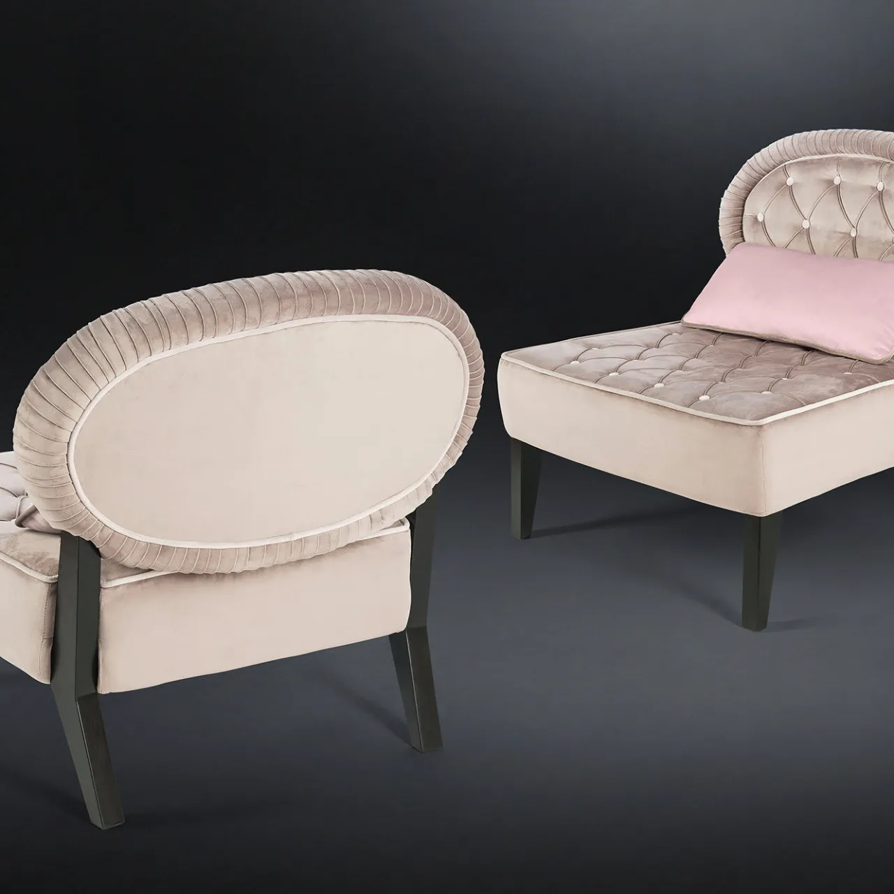 L’ispirazione tradizionale e l’estetica moderna danno vita a questo design unico che offre comfort e un delicato accento decorativo in un ingresso, un soggiorno, uno studio o una camera da letto. La seduta profonda e gli schienali ovali sono imbottiti con una fodera in poliestere e poggiano su una struttura in legno. Le gambe affusolate, inclinate nella parte posteriore, sono laccate in nero opaco, in netto contrasto con la tonalità rosa tenue del rivestimento in velluto con profili chiari, ciuffi e struttura posteriore placcata. Il cuscino decorativo non è incluso.