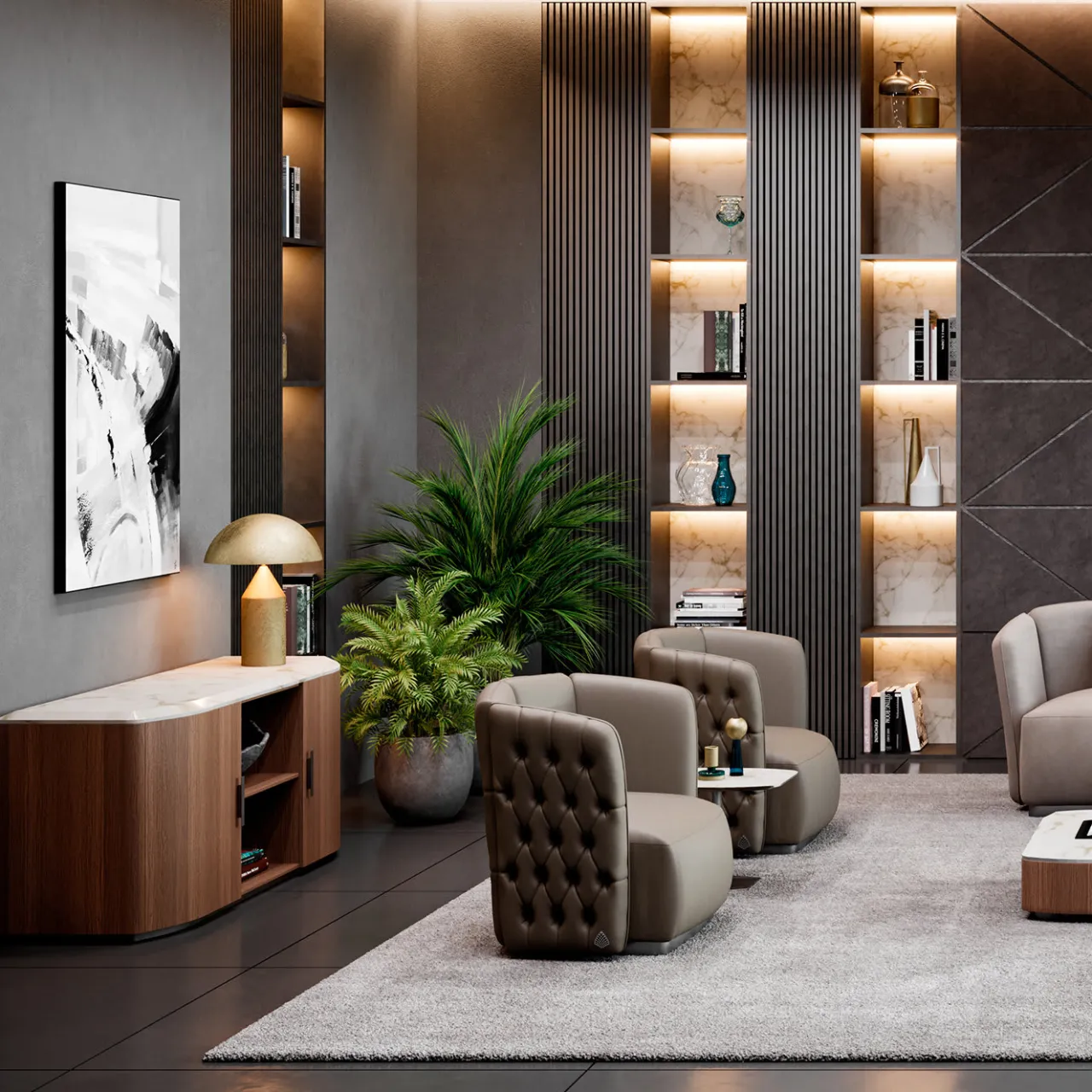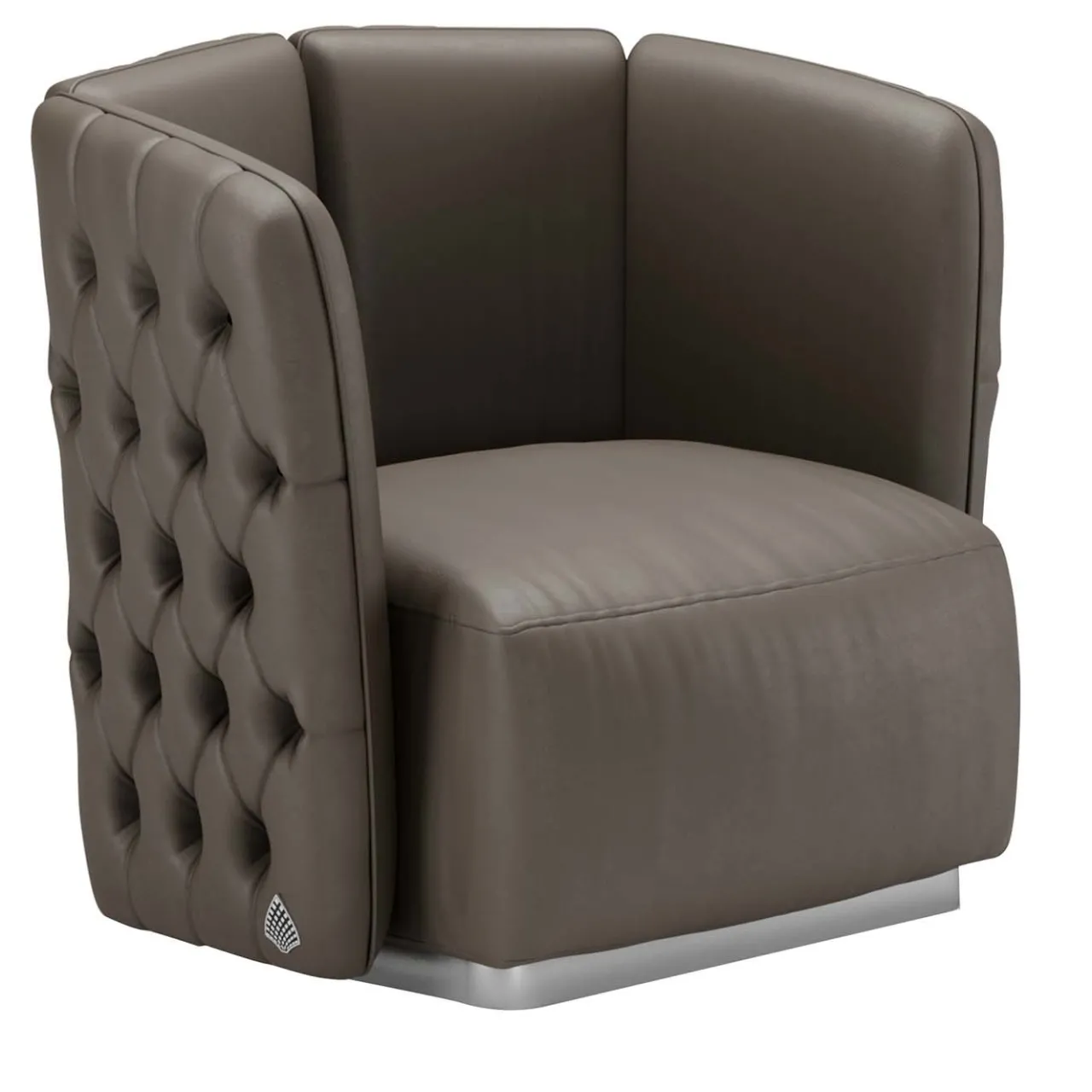 Questo straordinario design con schienale capitonné fonde linee classiche e moderne con una manifattura raffinata che impiega solo materiali di prima qualità. Dotata di cinghie elastomeriche incrociate, la struttura in legno della poltrona è imbottita con schiuma a densità differenziata e vanta un prezioso rivestimento in pelle marrone. Poggiata su una base in legno rivestita in metallo con finitura al titanio, la seduta e lo schienale sono imbottiti di gomma e piuma per garantire un comfort eccellente.