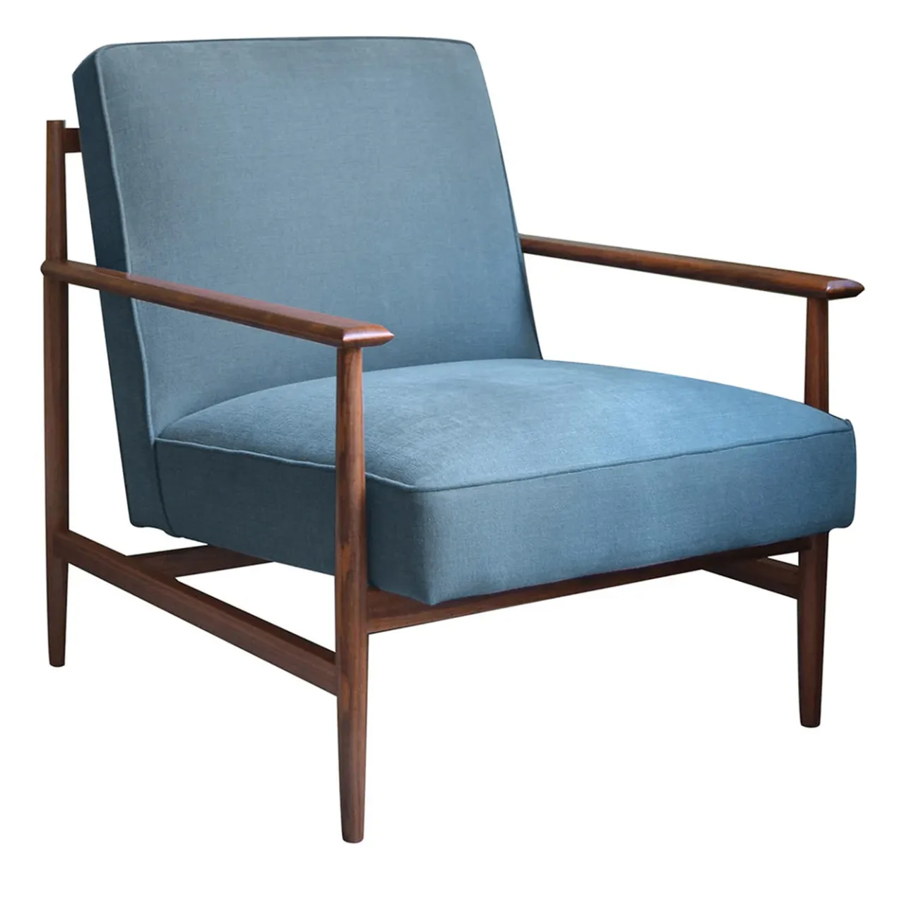 La poltrona Gaia, ispirata al design brasiliano degli anni ’50, unisce semplicità ed eleganza senza tempo. Realizzata da abili artigiani italiani in noce, frassino o frassino tinto wengé. La seduta, sostenuta da cinghie elastiche per un maggiore comfort, può essere rivestita in velluto, misto lino-cotone o pelle Elmo. Qui è venduto con struttura in noce e seduta in lino-cotone blu polvere. Per personalizzazioni e ulteriori dettagli, consultare il Concierge.