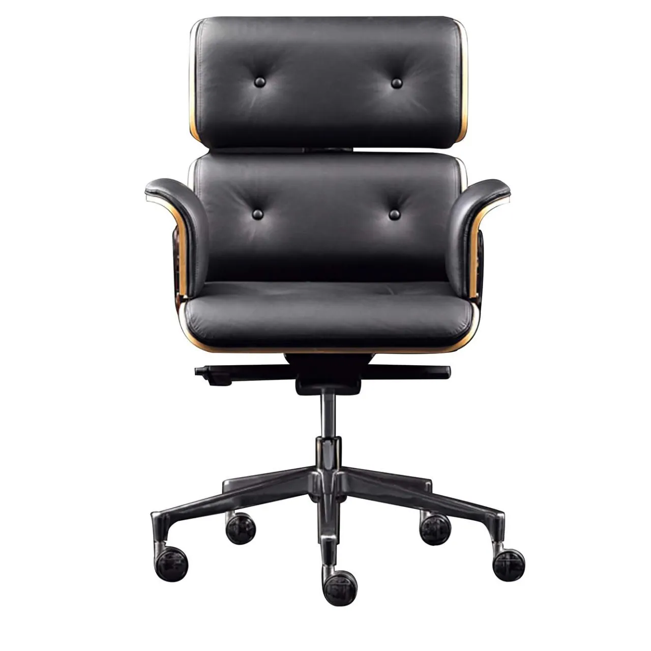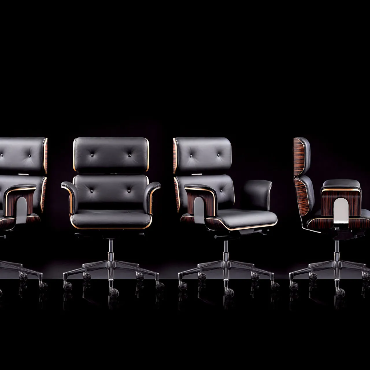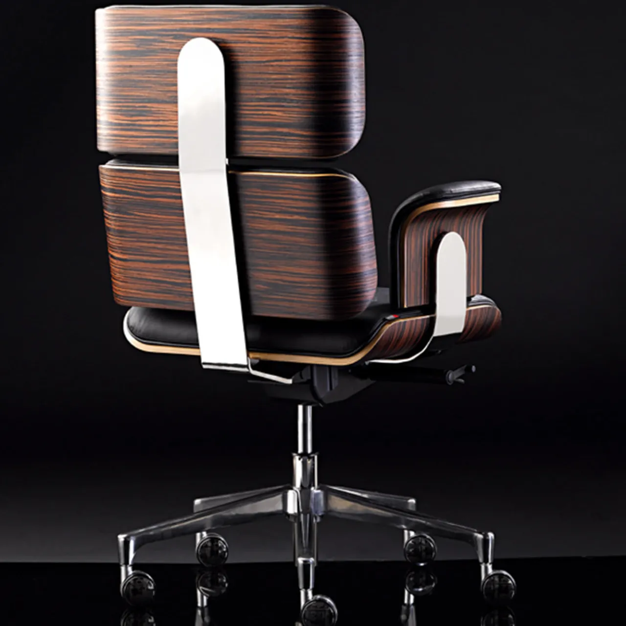 Questa poltrona girevole ha una base a cinque razze in alluminio fuso. Può essere bloccata in cinque posizioni di inclinazione e l’altezza del sedile viene modificata tramite un meccanismo pneumatico. La tensione dell’inclinazione può essere regolata in base al peso dell’utente. Realizzata in vera pelle nera con scocca in legno di faggio rifinita in ebano e struttura in acciaio cromato per schienale e braccioli. Disponibile in altri colori di pelle e finiture in legno.
