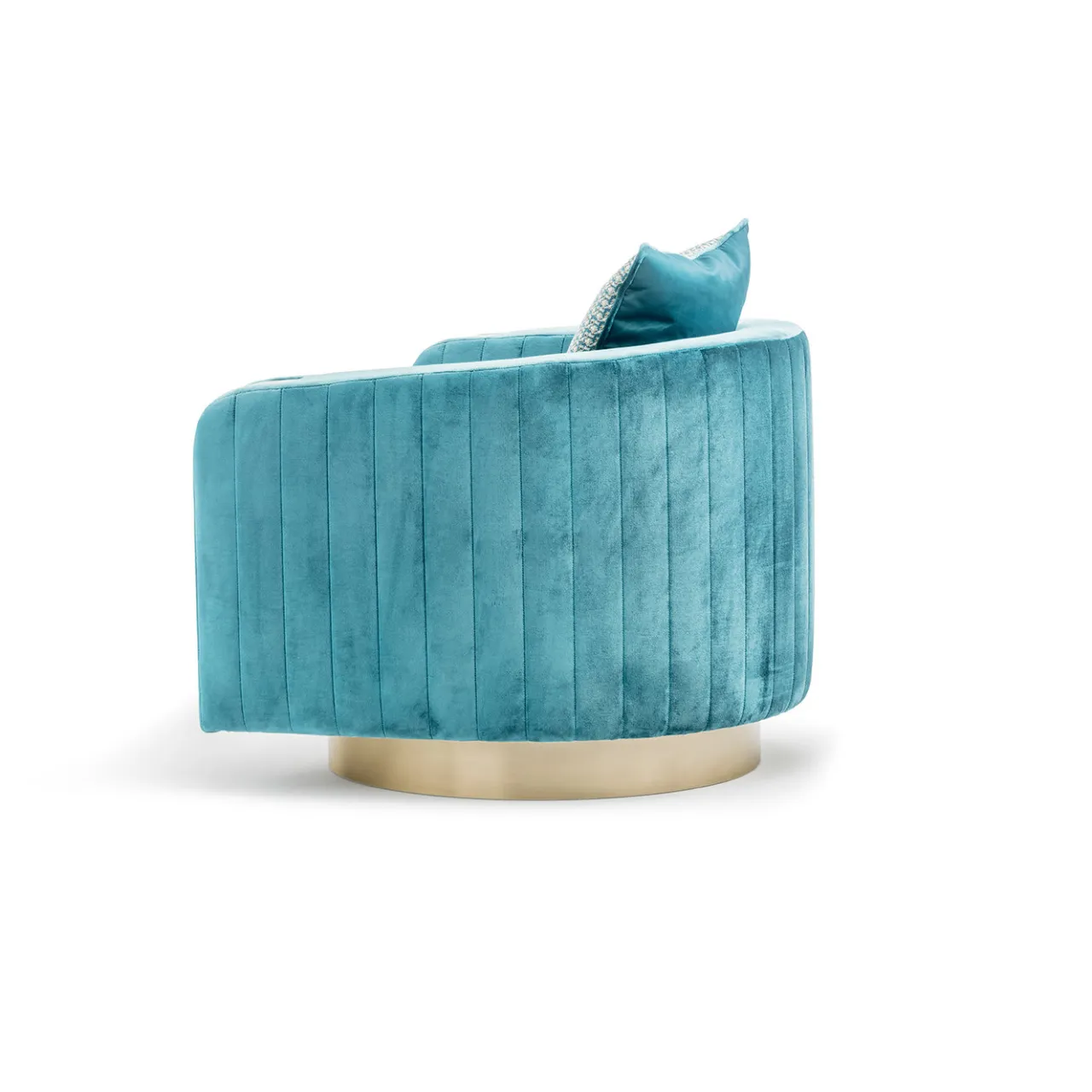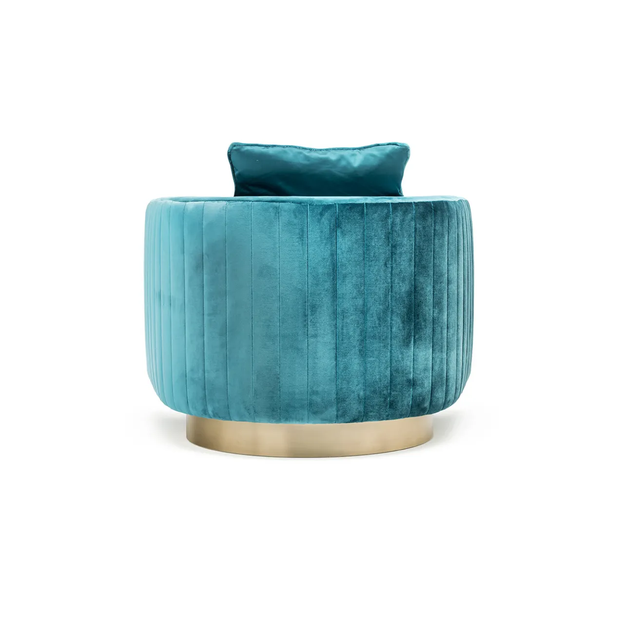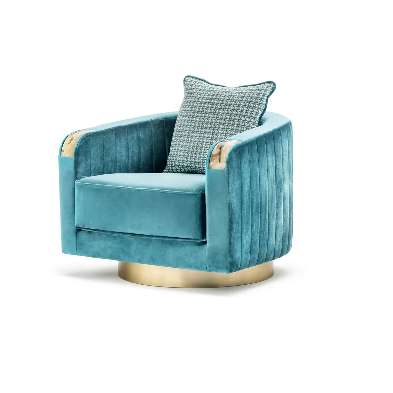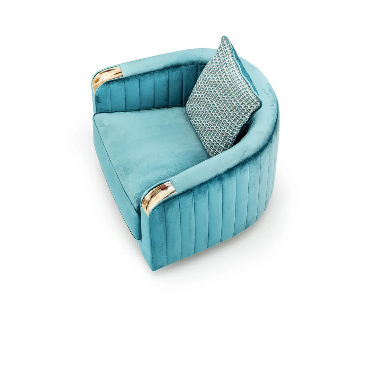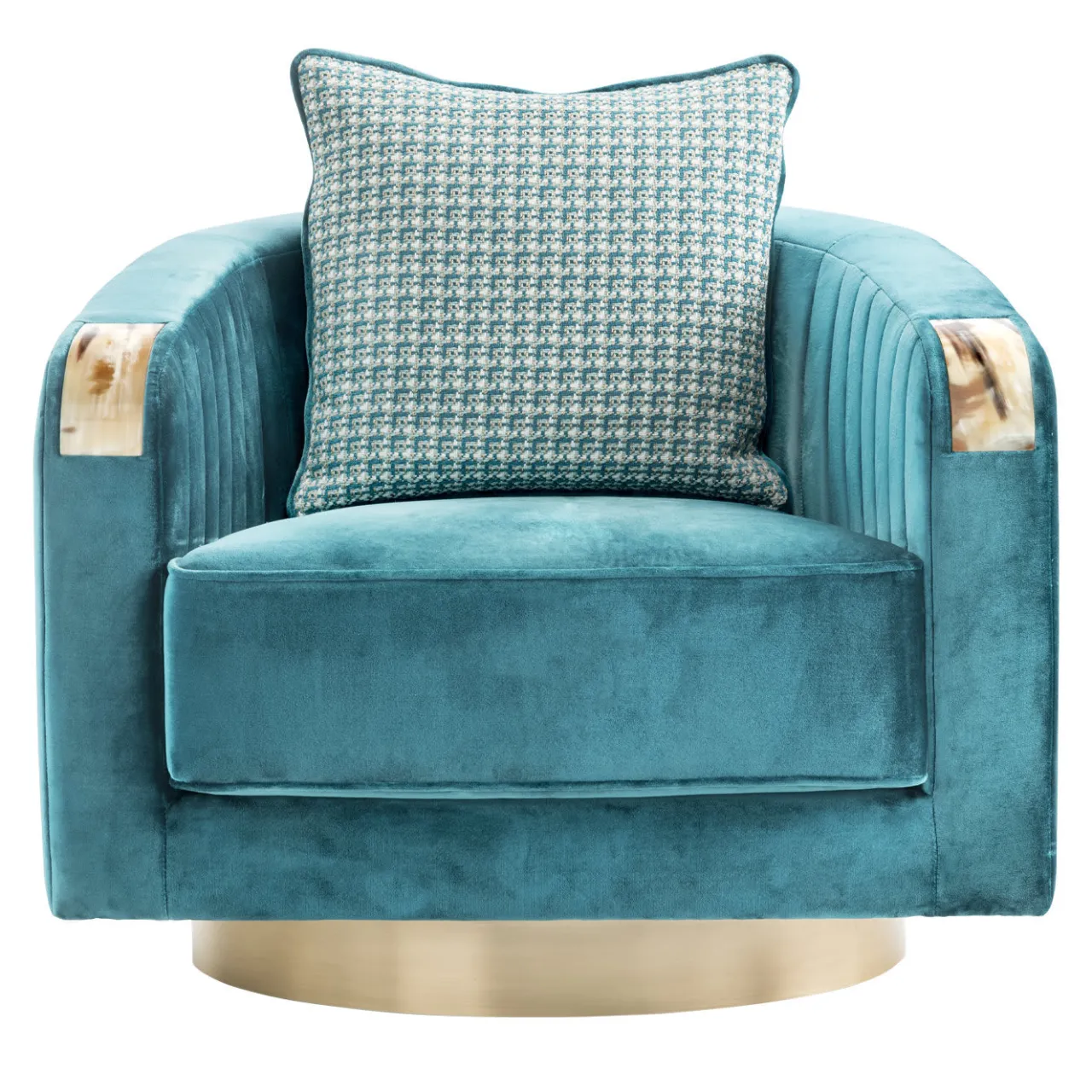 Disegnata da Filippo Dini, la poltrona girevole Rea è una splendida visione in velluto Splendido color ottanio. Con squisiti braccioli in corno curvato, una base in legno con effetto ottone satinato e uno schienale e braccioli a coste, la poltrona è anche comodamente imbottita in poliuretano espanso di alta qualità, piuma d’oca e memory foam.