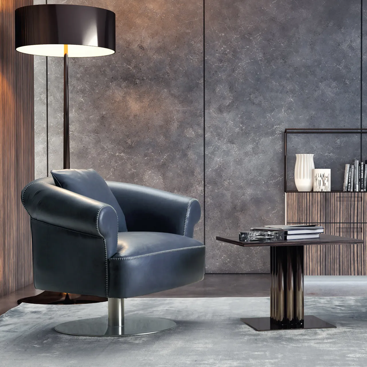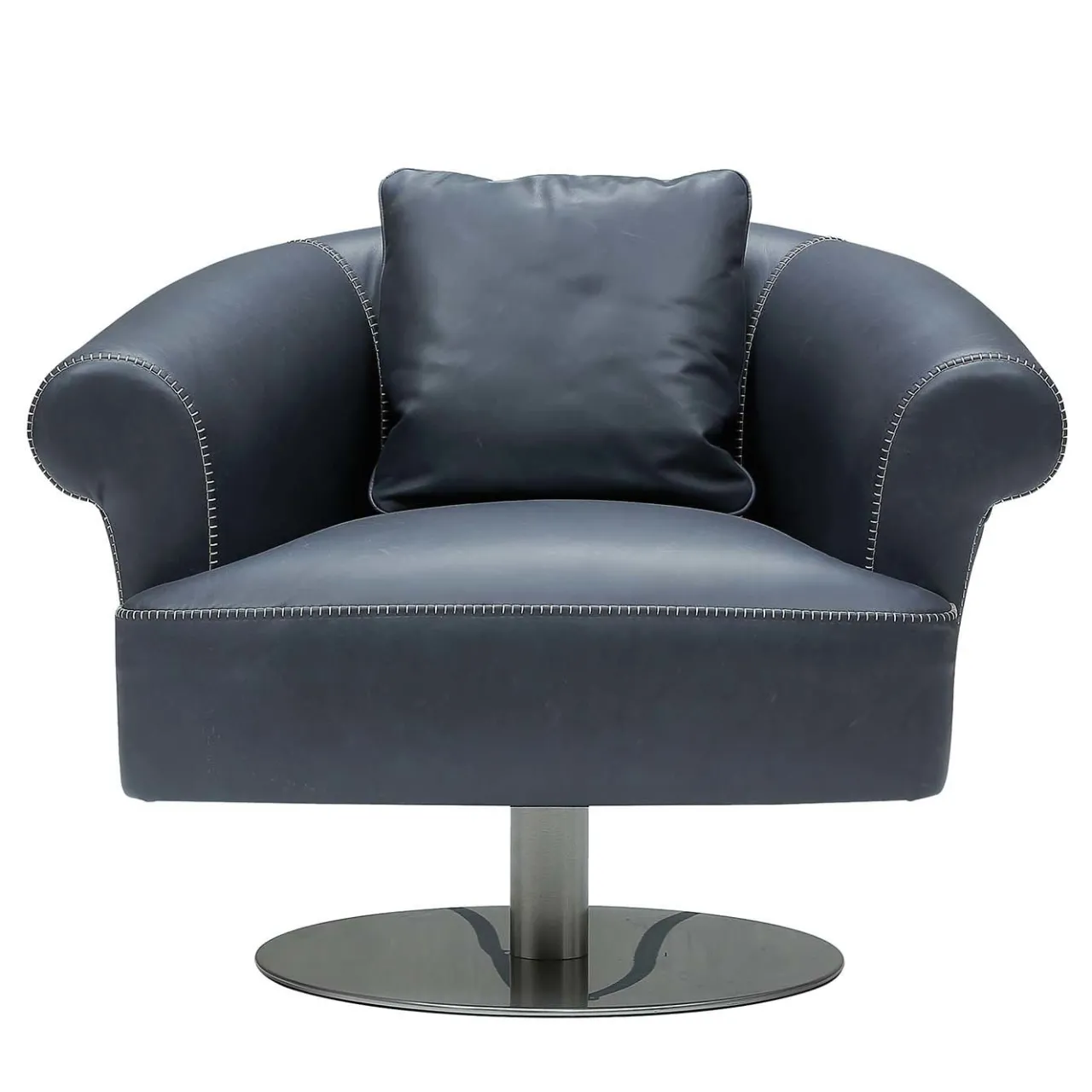 Perfetta per essere esposta in interni commerciali o residenziali sobri, questa poltrona girevole offre un comfort ineguagliabile grazie alla generosa imbottitura (85% poliuretano ad alta densità e 15% fibra di poliestere) e al pregiato rivestimento in pelle nabuk nera. La sua struttura, apparentemente semplice, poggia su un elemento tubolare in metallo (alto 23 cm) che si erge da una base rotonda in metallo (diametro 55 cm) e comprende uno schienale/braccioli avvolgenti che degradano dolcemente verso la parte anteriore. Il sistema di sostegno del telaio è costituito da cinghie elastomeriche.