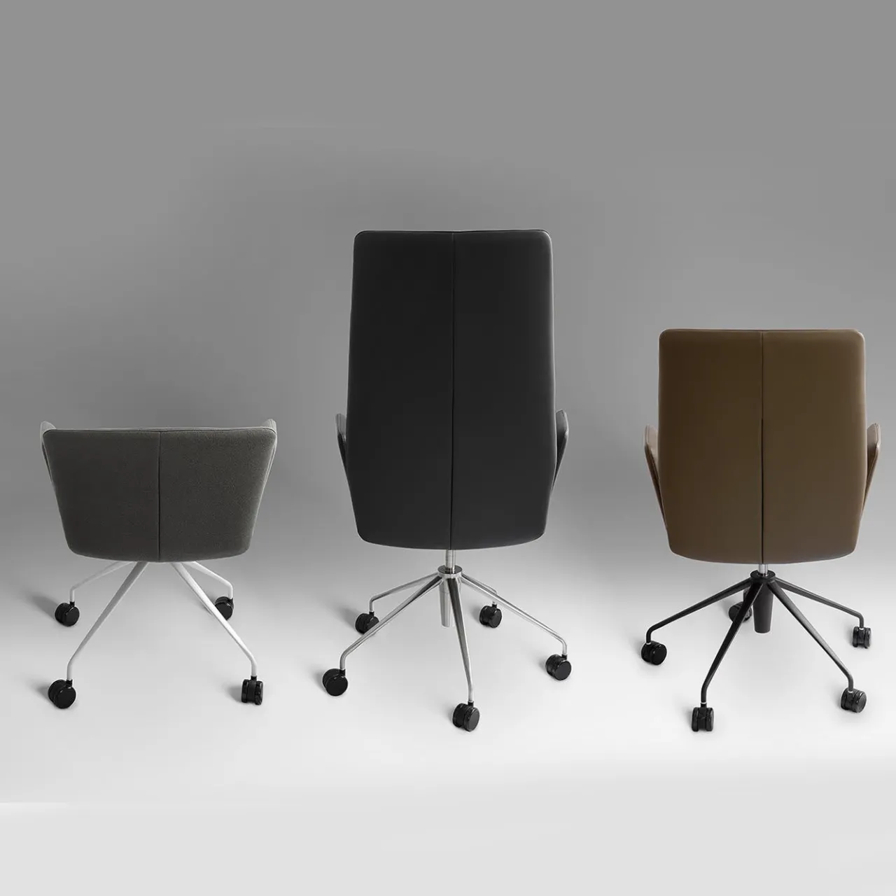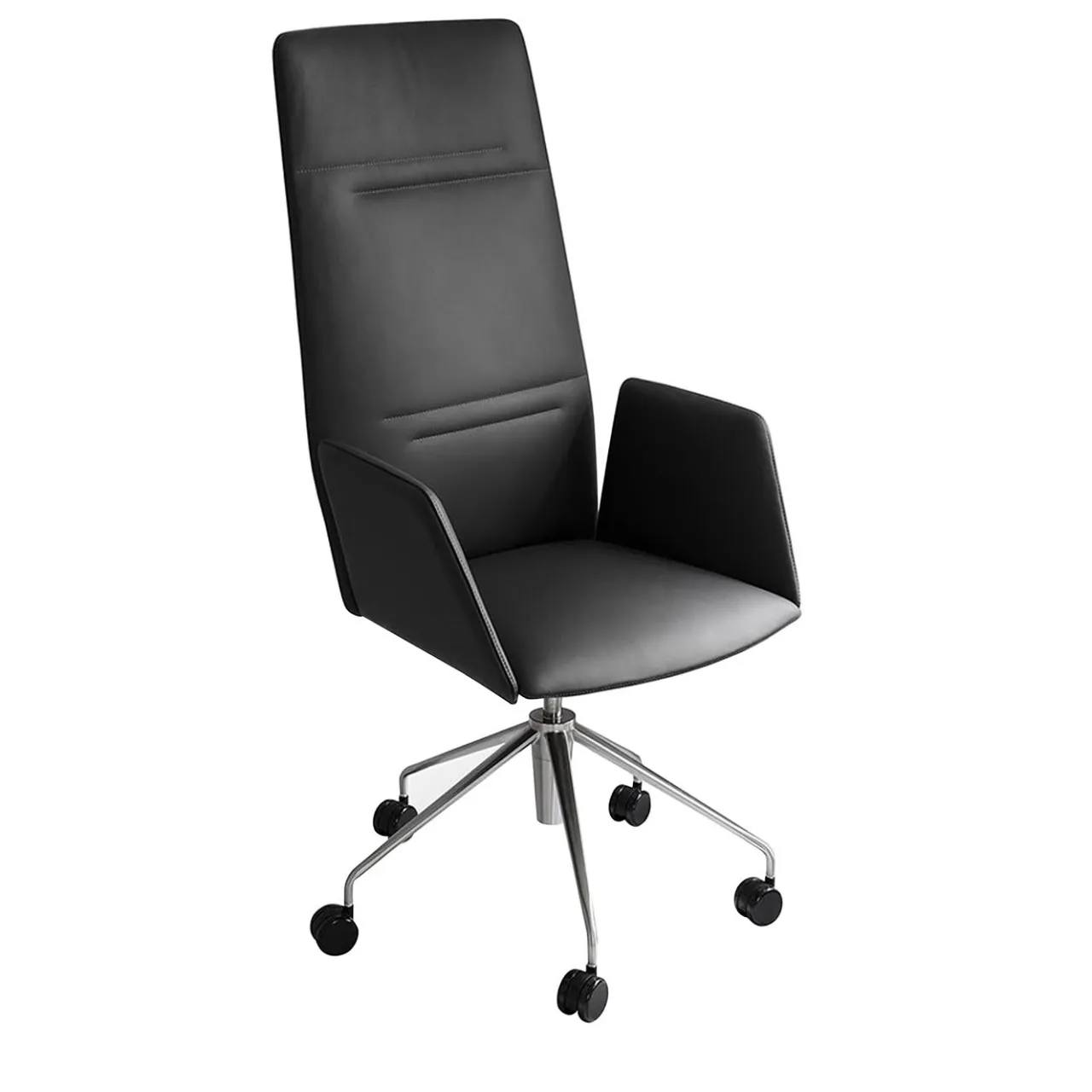 Questa esclusiva sedia con solida struttura in acciaio è la soluzione ideale per completare qualsiasi stile di ufficio. La sua morbida imbottitura e il rivestimento in pelle nera, uniti al meccanismo “responsive” che permette di adattare automaticamente la postura al peso dell’utente, assicurano un ottimo comfort grazie alla possibilità di regolare l’altezza della seduta. Lo schienale alto si integra con i braccioli chiusi che incorniciano la seduta, che poggia su una base in metallo nichelato a cinque razze con altrettante rotelle.