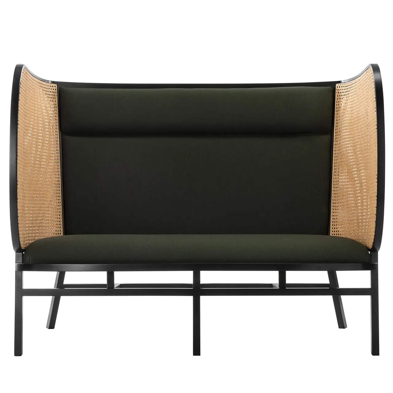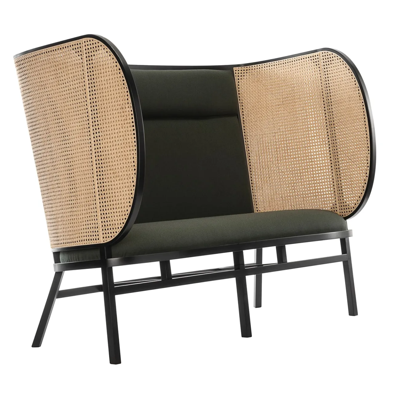 Un’aggiunta squisita alla collezione Hideout, questa poltrona è stata progettata dal duo svedese Front nel 2018. Presenta una struttura semplice in legno di faggio che sostiene una seduta imbottita. L’elemento di spicco è lo schienale alto, anch’esso imbottito, e i due fianchi avvolgenti, rivestiti con elegante paglia viennese e incorniciati in legno di faggio curvato a vapore – un omaggio ai punti fermi dei mobili Thonet. Il tessuto aggiunge un accento contrastante e contemporaneo al pezzo.
