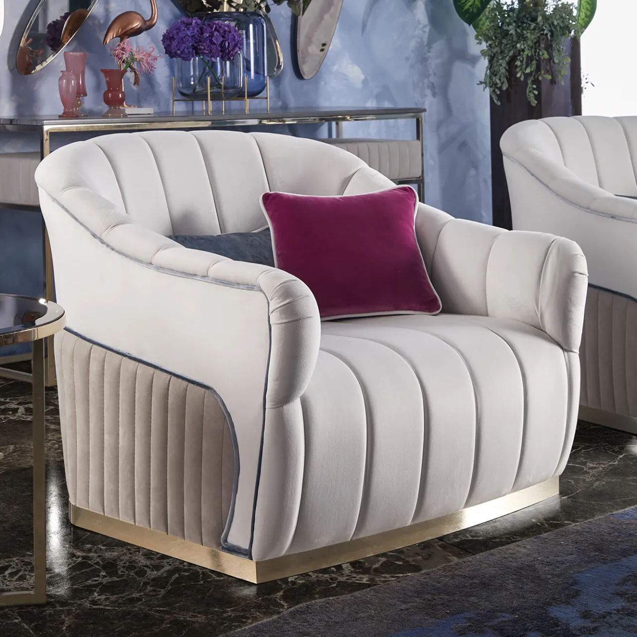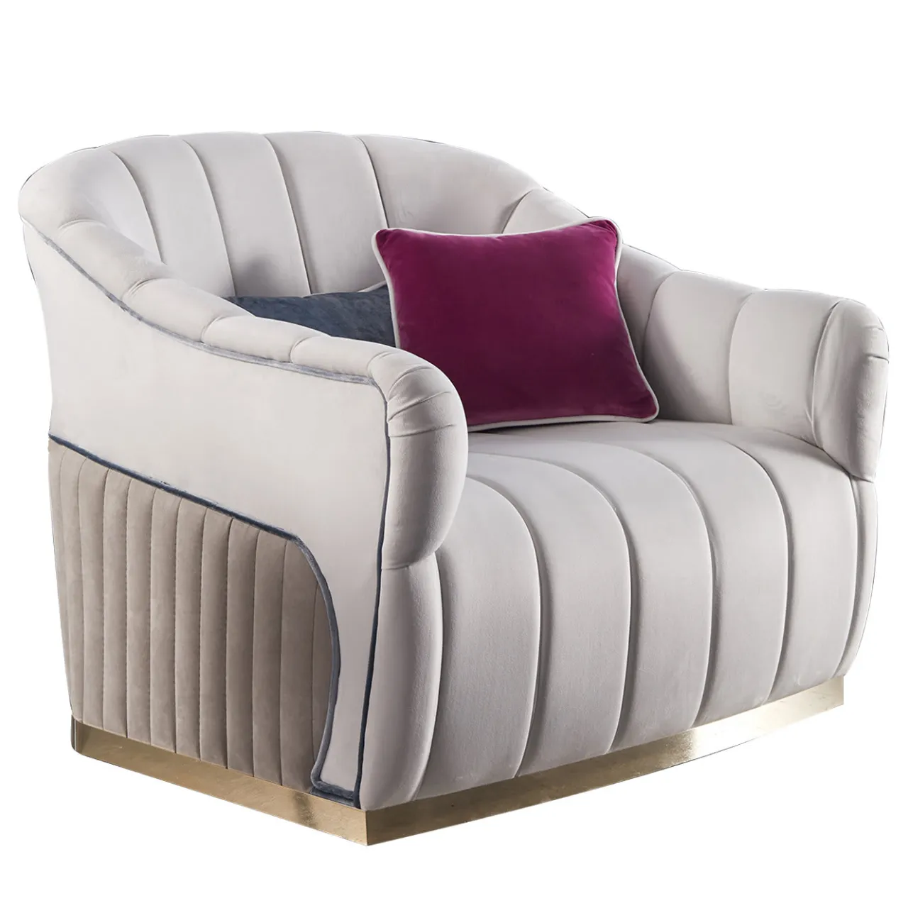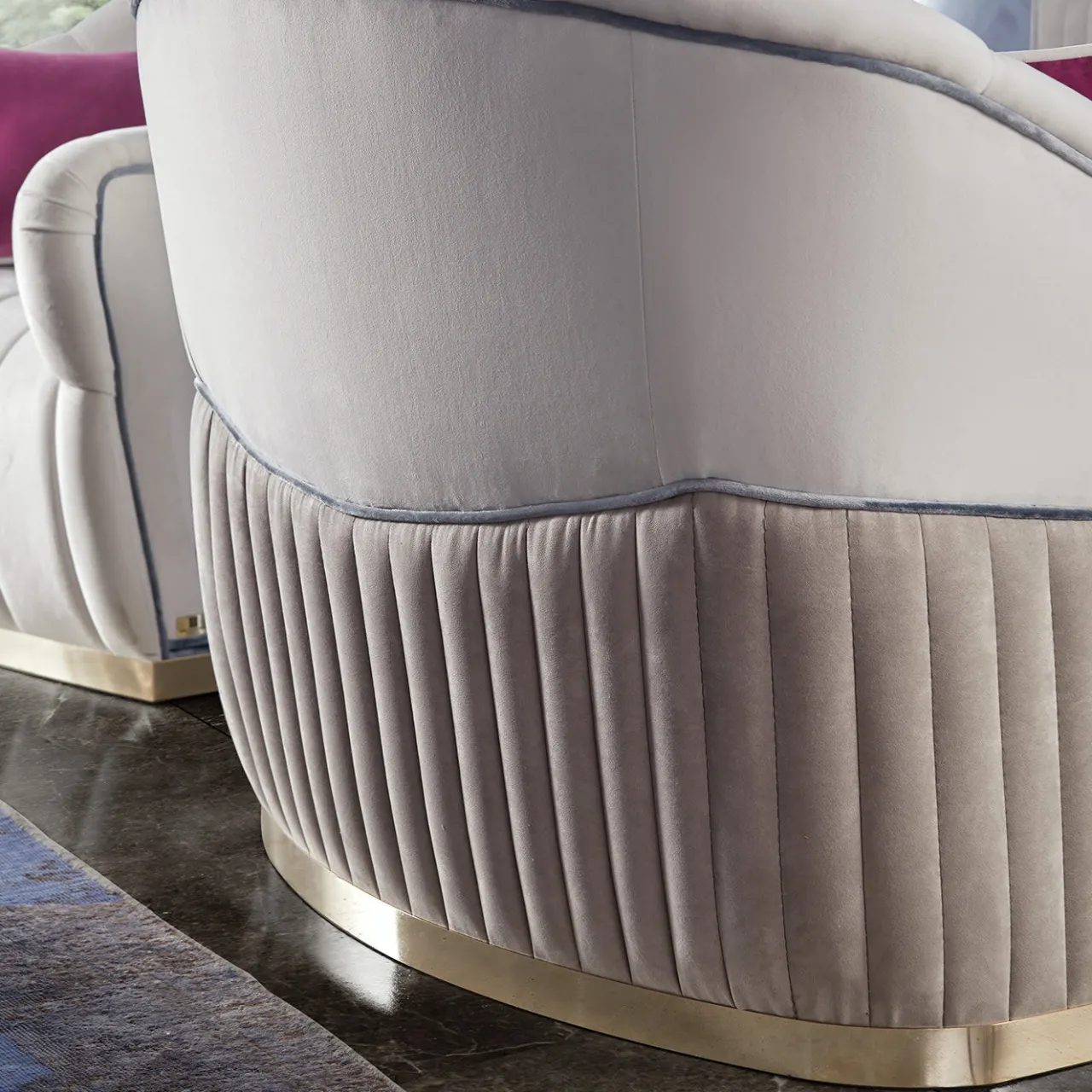 La poltrona Crystal, che emana vibrazioni lounge chic, è realizzata a mano in Italia, nella regione Veneto. Perfetta per un salotto contemporaneo, la poltrona poggia su una base in metallo dorato ed è rivestita in ecopelle in una fresca tonalità sabbia. La poltrona è rivestita in tessuto color avorio e viene fornita con cuscini decorativi.