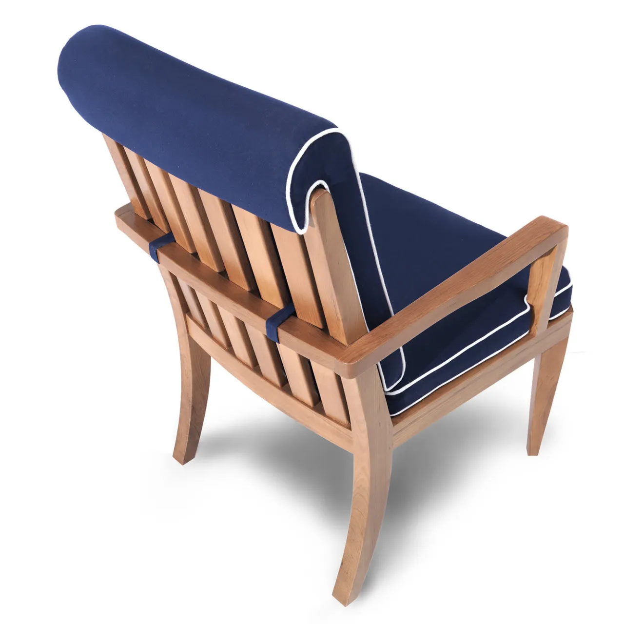 Questa poltrona esclusiva combina la durevolezza con la migliore estetica moderna, vantando una solida base in iroko nella sua tonalità calda. La robusta struttura comprende uno schienale leggermente inclinato composto da elementi verticali avvolti da una barra orizzontale che si estende nella parte anteriore per formare i braccioli dritti. Il rivestimento in tessuto blu intenso è esaltato dalle finiture a contrasto che ricoprono la seduta e lo schienale riccamente imbottiti, creando una fusione perfetta di comfort e stile.