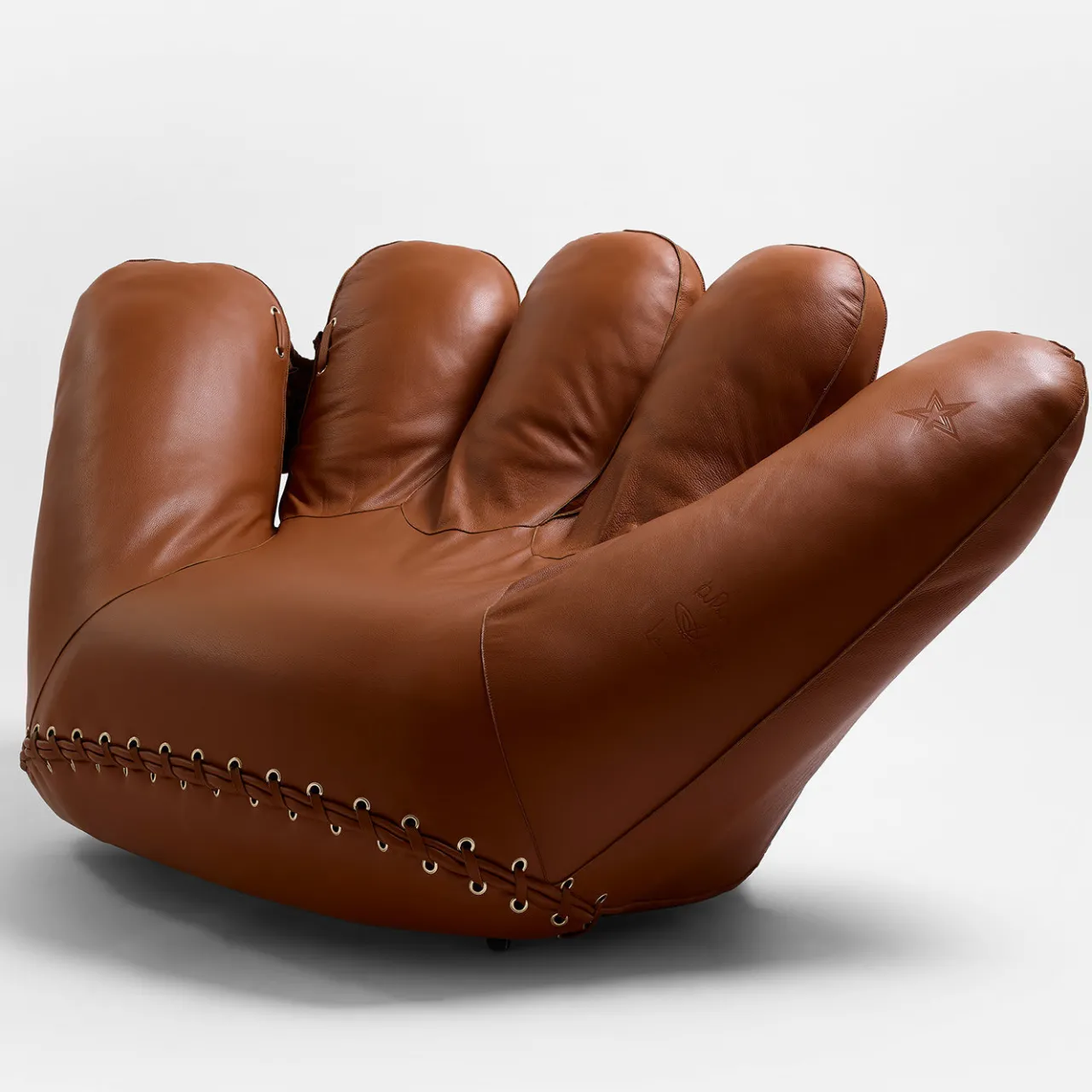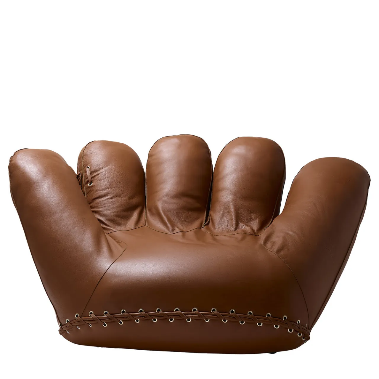 Un design iconico e audace che rende omaggio al campione di baseball americano Joe DiMaggio, questa straordinaria poltrona ha la forma di un enorme e avvolgente guanto da baseball. Perfetto complemento del pouf Joe Ball, il suo carattere ispirato alla Pop Art è esaltato dal rivestimento in pelle marrone. Morbidamente imbottita in poliuretano espanso preformato, poggia su una struttura in metallo.