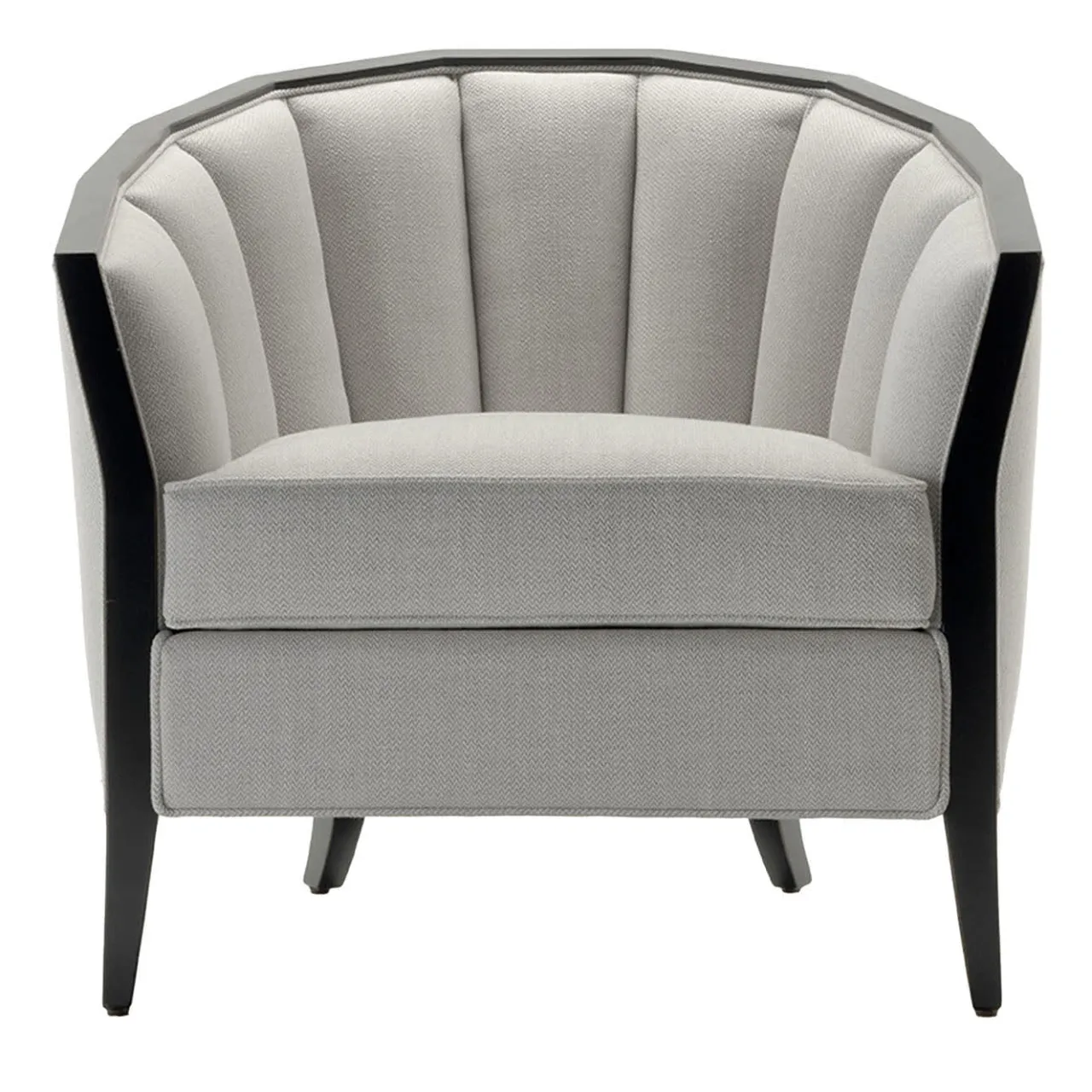 Tanto avvolgente quanto rigorosa, questa poltrona è una sapiente sintesi di glamour e comfort. Caratterizzata da un avvolgente profilo polilineare che degrada fino a inglobare i braccioli, la struttura in faggio essiccato lucidato wengé si contrappone al fresco rivestimento in lino beige e grigio con un delicato disegno a zig-zag d’ispirazione anni ’60. L’elegante design a canali che caratterizza lo schienale sottolinea ulteriormente la generosità dell’imbottitura.