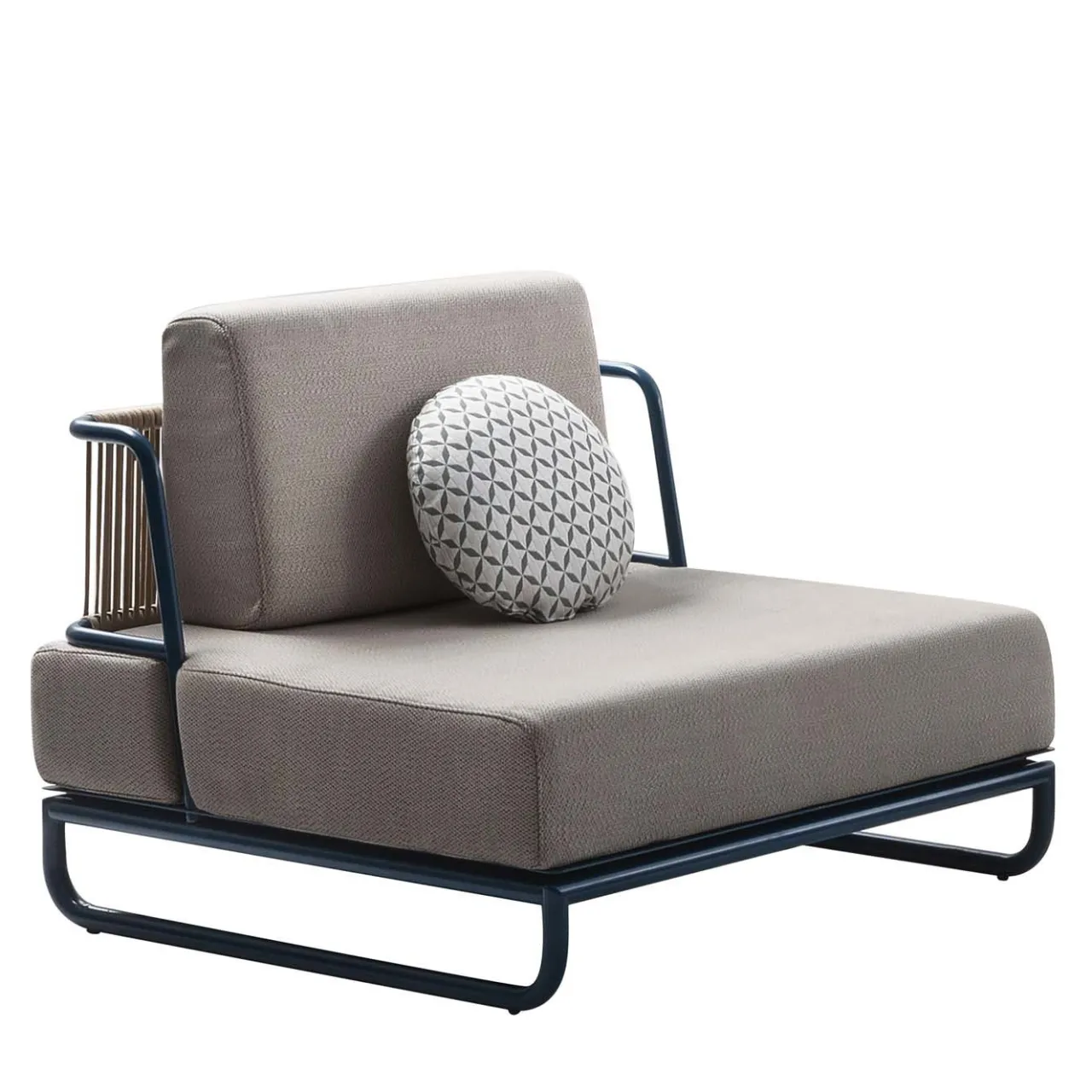Parte di una serie di pezzi modulari che possono essere combinati per creare aree di seduta eleganti e confortevoli, questa poltrona è caratterizzata da un design pulito. Adatta anche agli ambienti interni, l’elegante struttura laccata blu è realizzata in acciaio inox cilindrico piegato ed è dotata di cinghie tecniche. Imbottiti con schiuma Dry-Fly morbida e resistente all’acqua, i cuscini della seduta e dello schienale sono rivestiti in tessuto beige. Lo schienale si distingue per il motivo verticale di corda tecnica intrecciata a mano. Chiedete al Concierge le opzioni di personalizzazione e i prezzi.