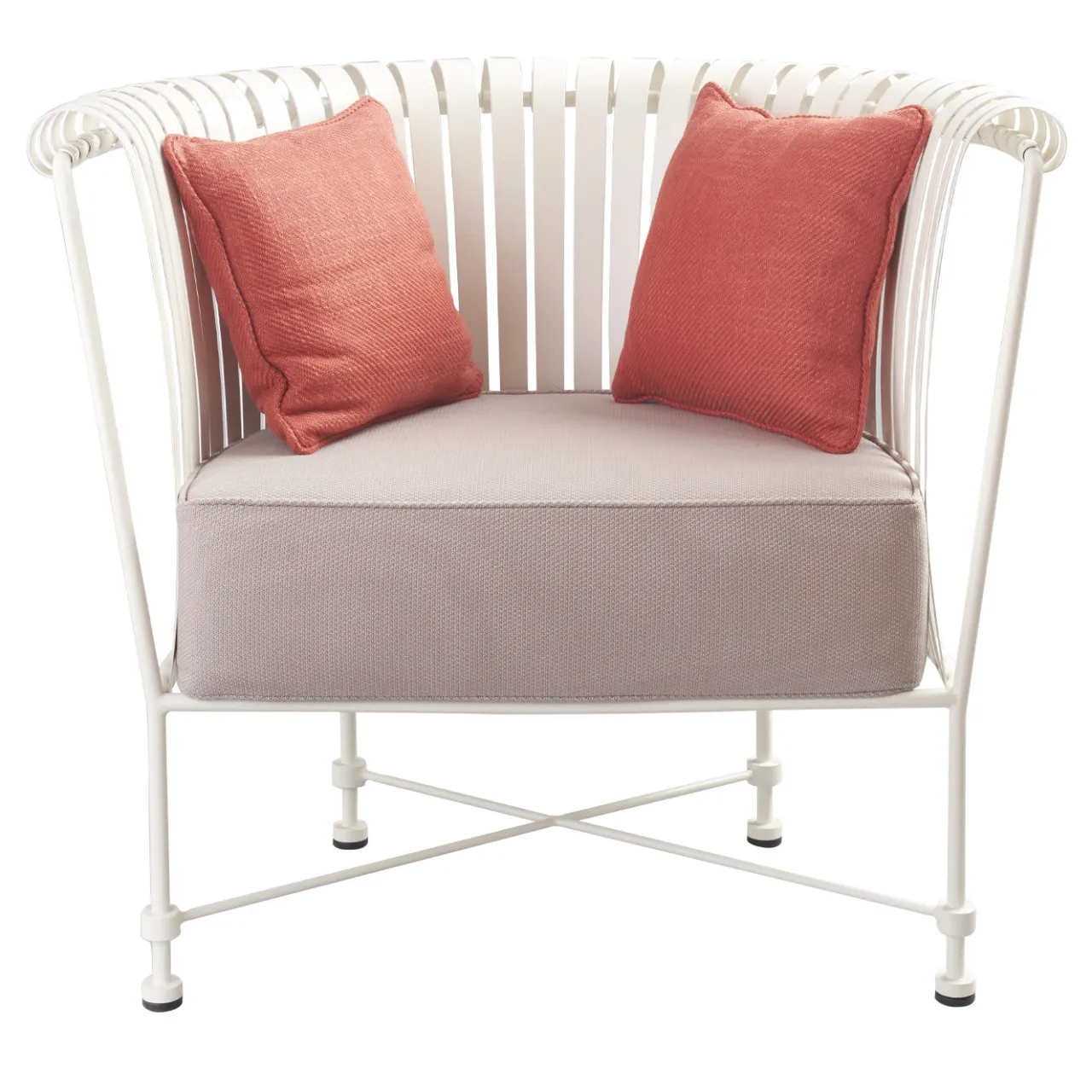 Questa poltrona è realizzata in acciaio inossidabile piegato a mano, zincato e verniciato a polvere. Realizzata in Italia da esperti artigiani secondo tecniche storiche, il suo schienale unico a più doghe offre un mix di tradizione artigianale fiorentina e design creativo e contemporaneo. L’articolo comprende cuscini in tessuto adatti all’uso esterno.