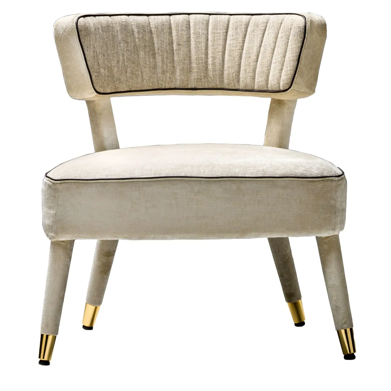 Semplice ma audace, la silhouette moderna di questa straordinaria poltrona è caratterizzata da una seduta generosa e da uno schienale aperto e arrotondato, rivestito in poliuretano espanso con una fodera non rimovibile in una suggestiva fantasia bianca. Le gambe cilindriche imbottite sono leggermente affusolate e sono impreziosite da ghiere in metallo dorato. Perfetta combinazione di comfort ed eleganza, questa poltrona sarà un’aggiunta accattivante all’arredamento di uno studio o di un soggiorno moderno. Su richiesta, sono disponibili certificazioni per il settore contract e commerciale.