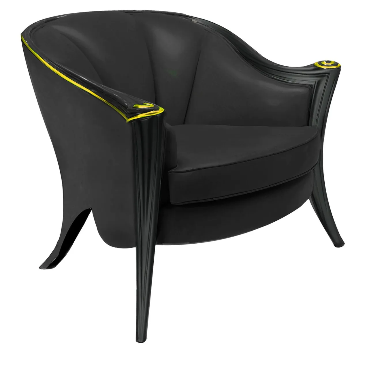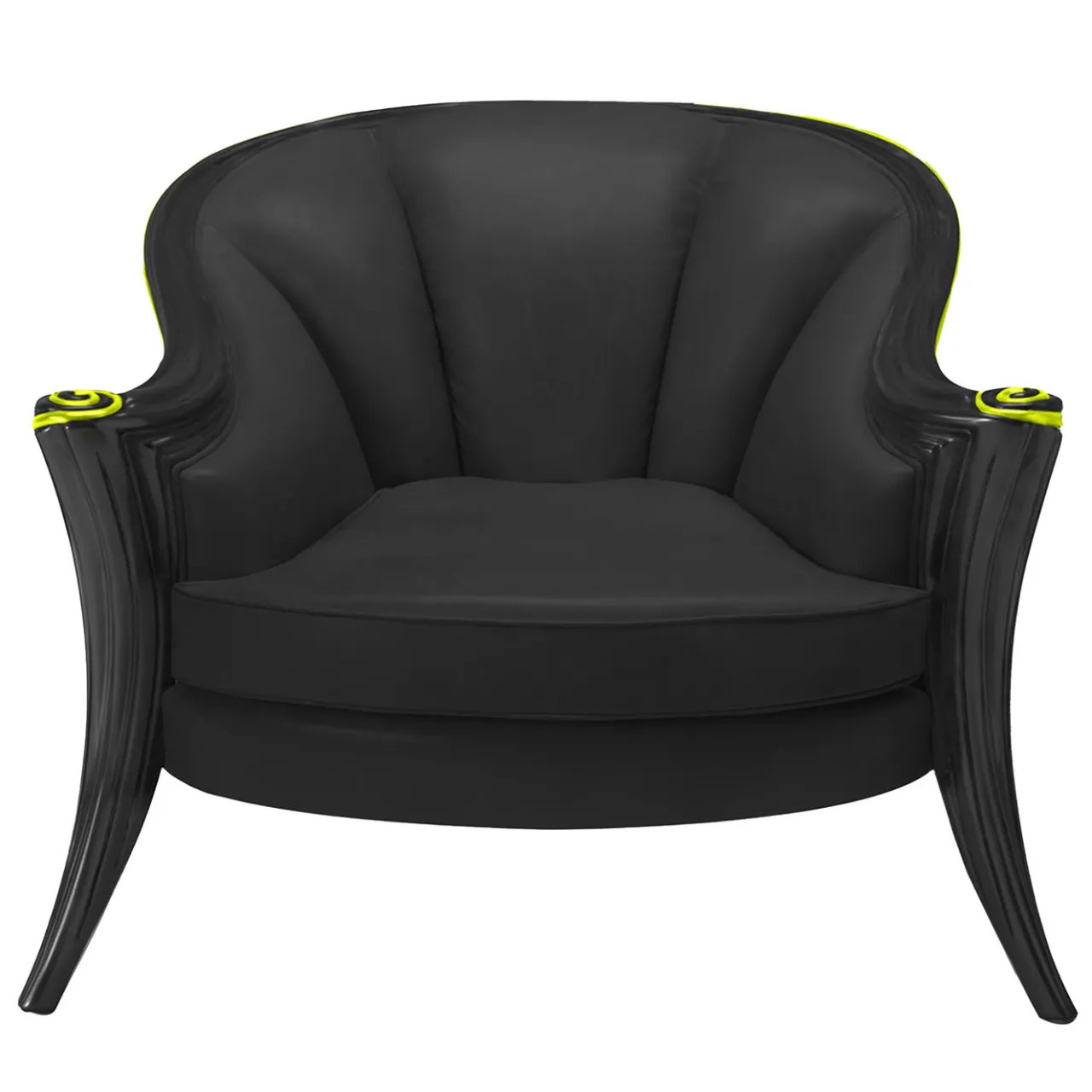 Sottili profili laccati in verde lime sono l’unico contrasto cromatico consentito a questa poltrona in peluche proposta in un look altrimenti total black. Avvolta da un pregiato rivestimento in pelle nera, la seduta è caratterizzata da un elegante disegno trapuntato le cui morbide curve si armonizzano con quelle dei profili intagliati della struttura in legno. Si prega di contattare il Concierge per le opzioni di personalizzazione disponibili.