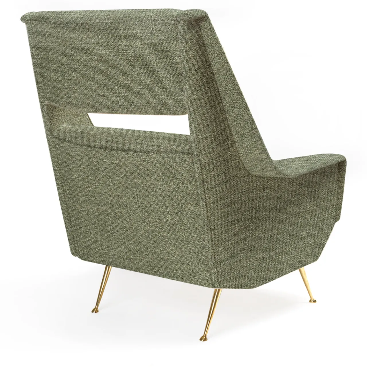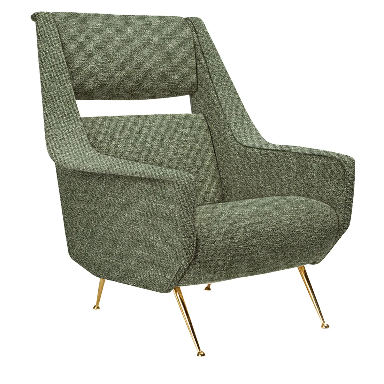 Caratterizzata da linee eleganti ed essenziali e da un carattere deciso, questa poltrona sarà il complemento perfetto per un interno minimalista. Poggiata su piedini metallici sottili e inclinati e rivestita in morbido tessuto color crema, la sua silhouette capiente è caratterizzata da uno schienale semiaperto e da braccioli dritti.