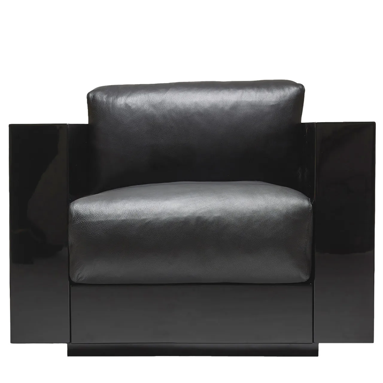Geometrie minimaliste si fondono con un’estetica raffinata in questa intramontabile poltrona total black della Collezione Saratoga di soluzioni di seduta disegnate da Lella e Massimo Vignelli. Elegante e rigorosa, la struttura è impreziosita da una stupenda laccatura in poliestere nero lucido, che si abbina al colore nero del rivestimento in pelle di prima qualità che ricopre i cuscini di seduta e di schienale, morbidamente imbottiti in piuma.