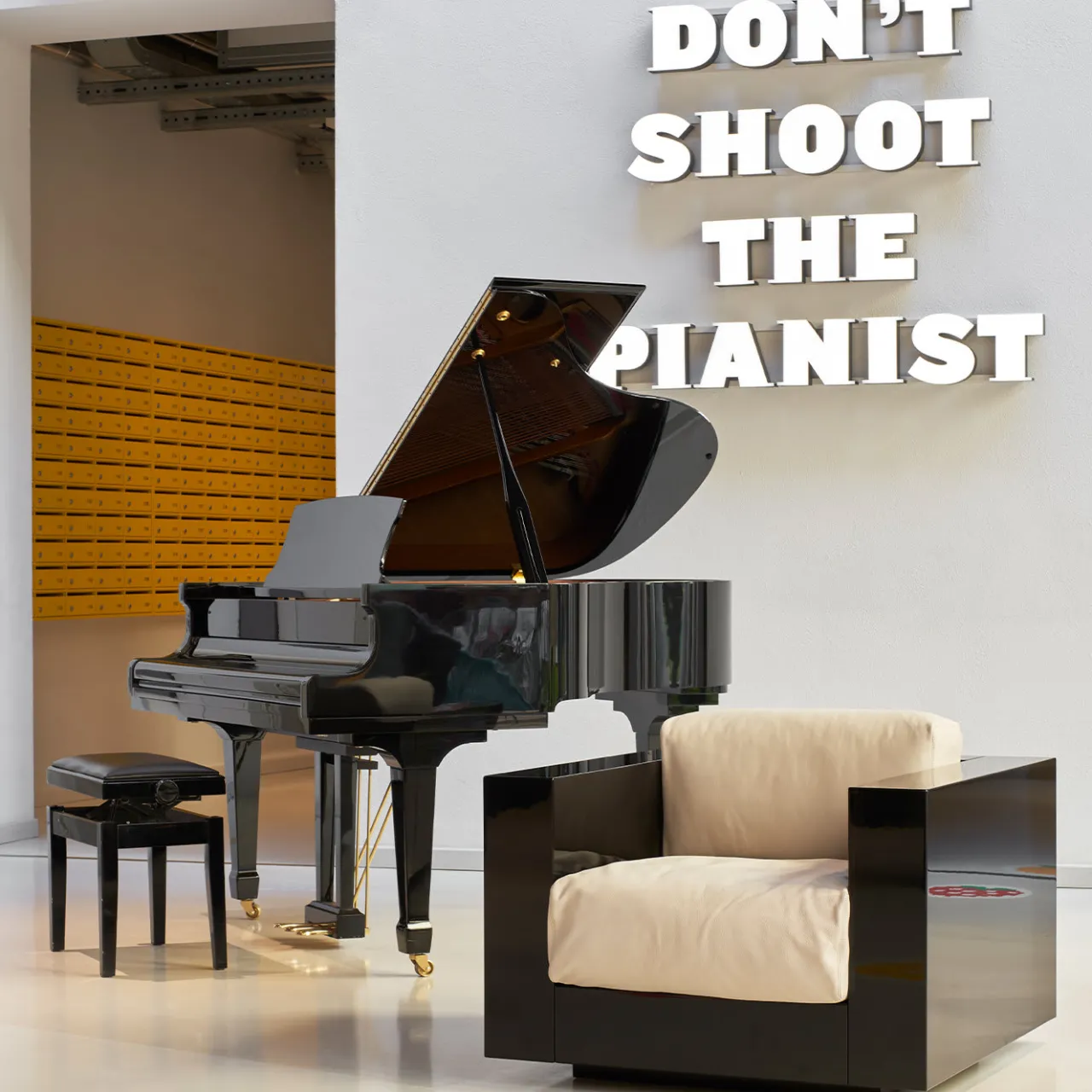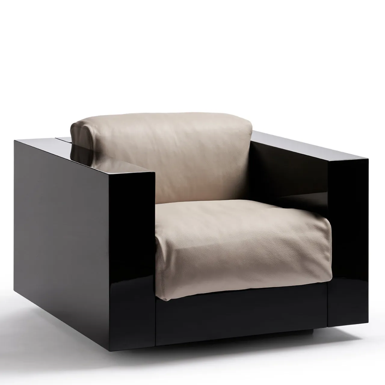 Splendido pezzo di design di sottile raffinatezza, questa poltrona si distingue per la struttura in legno, robusta e rigorosamente geometrica, che contrasta magnificamente con i morbidi cuscini della seduta e dello schienale, spesso imbottiti. Riempiti di piume, i cuscini sono rivestiti in pregiata pelle bianca, che contrasta anche con la laccatura nera lucida in poliestere della struttura. Un design unico e iconico di Lella e Massimo Vignelli.