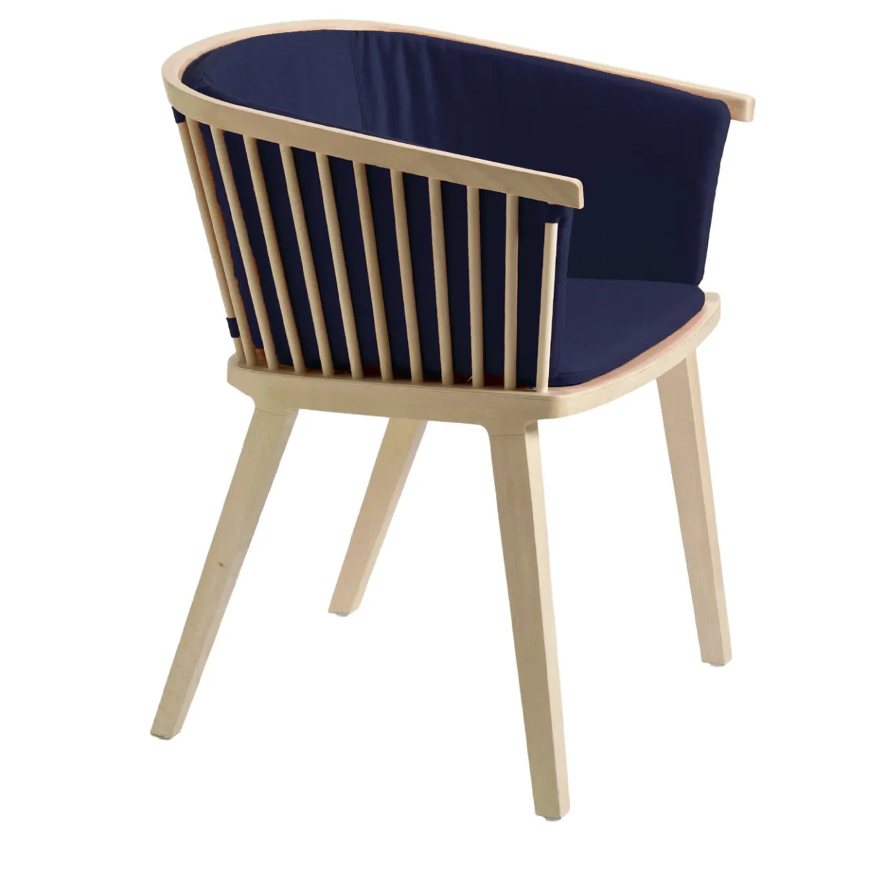 Disegnata da Lorenz+Kaz, questa sedia moderna e tradizionale può essere una sedia da tavolo, elegante e informale allo stesso tempo. Progettata sulla base di un chiaro brief: “creare una poltrona industriale dal gusto artigianale, ispirata alla tradizionale sedia inglese Winsor”. La complessa struttura, soprattutto nello schienale, è composta da aste ad incastro inserite nella base. Il cuscino imbottito è proposto in un pregiato velluto italiano blu. Disponibile in faggio massiccio o laccato opaco in bianco o nero.