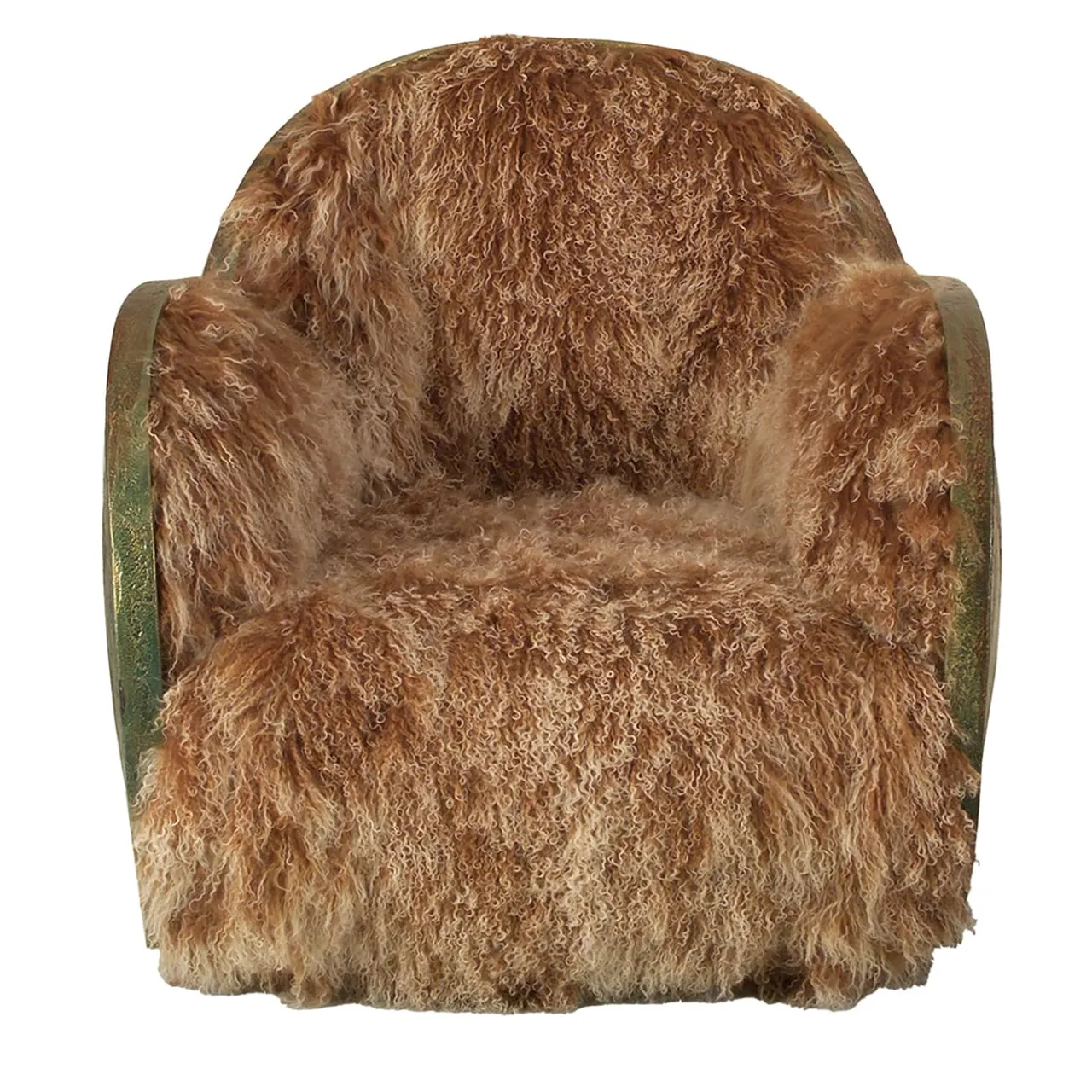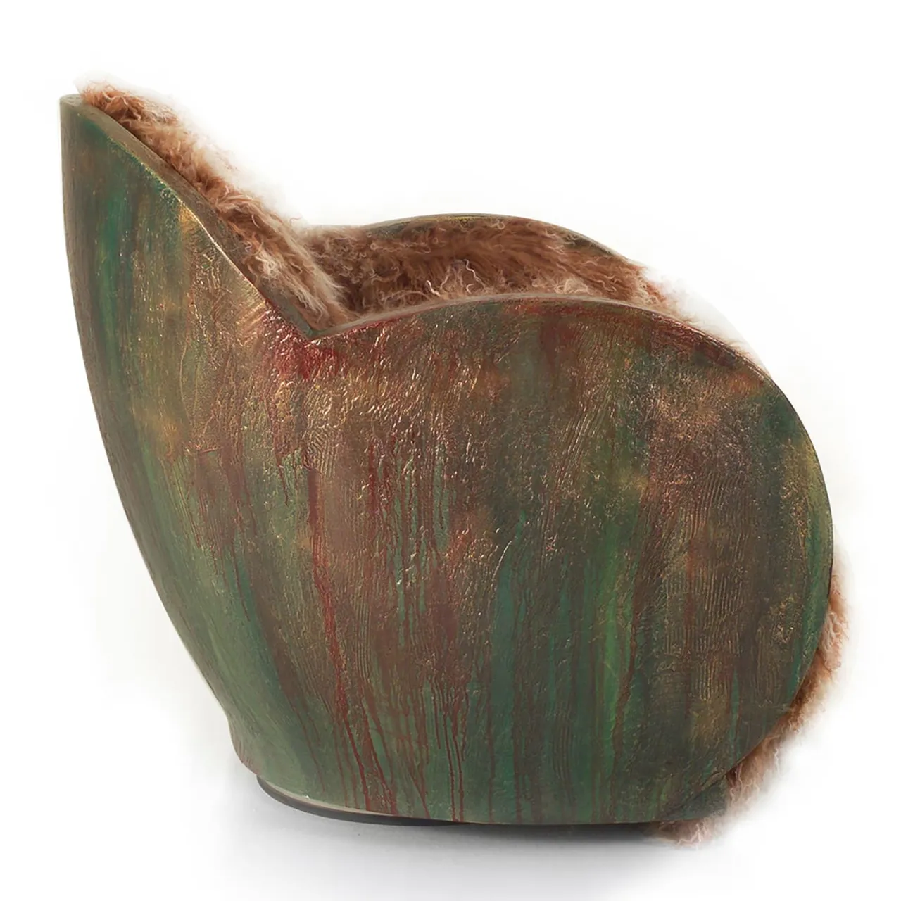 Poltrona girevole dall’accogliente forma a uovo. La poltrona è composta da uno schienale in legno con una finitura materica che ricorda la corteccia di un albero e arricchita da un rivestimento in pelliccia “mongola”.