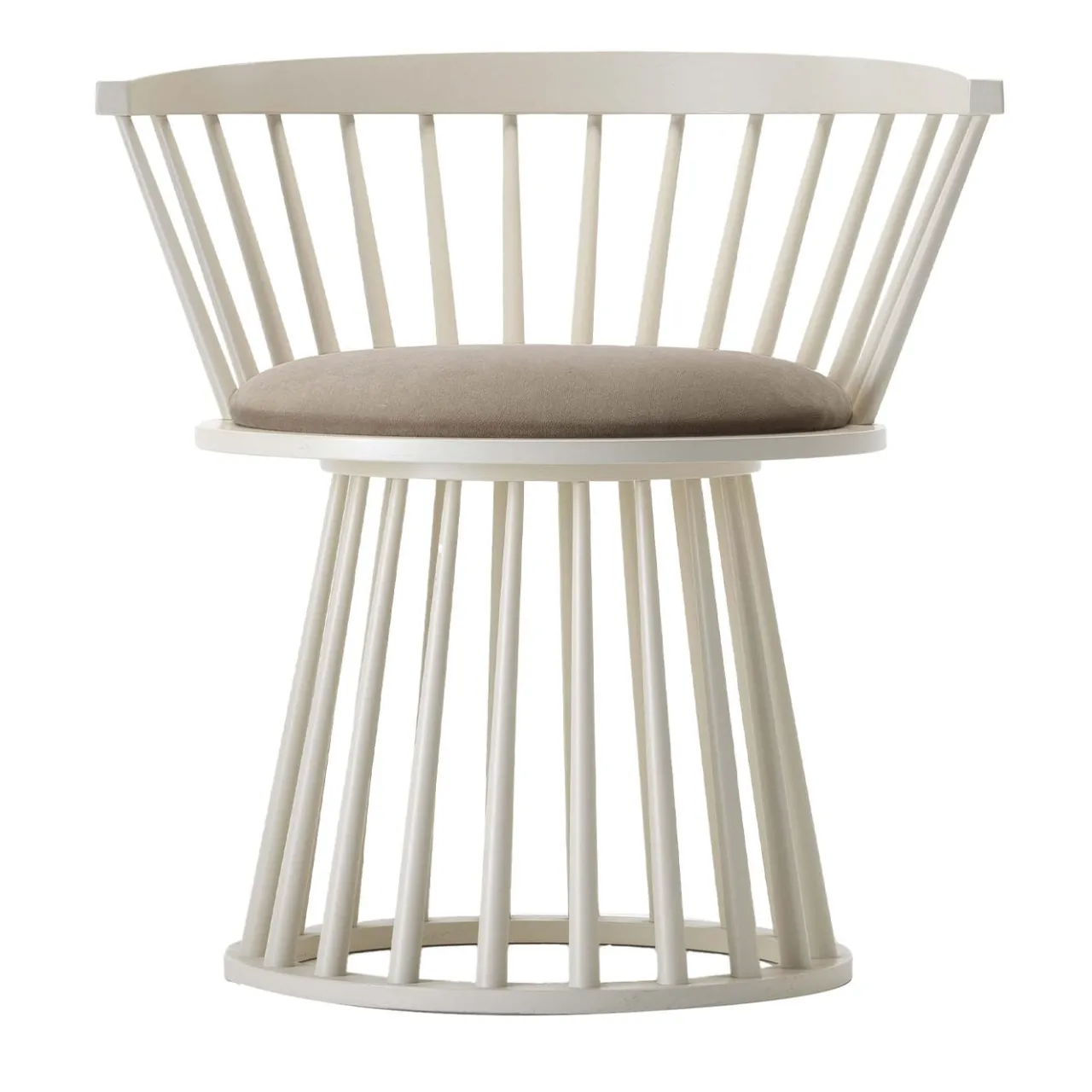 Tanto audace quanto ariosa, questa poltrona luminosa laccata di bianco evoca la tenerezza del cullare il sonno dei bambini con il suo design che ricorda le culle minimaliste in stile scandinavo. La struttura in faggio essiccato accoppia una base conica a una scocca completamente avvolgente, garantendo un maggiore comfort grazie alla seduta imbottita e sigillata da un raffinato rivestimento in velluto color tortora.