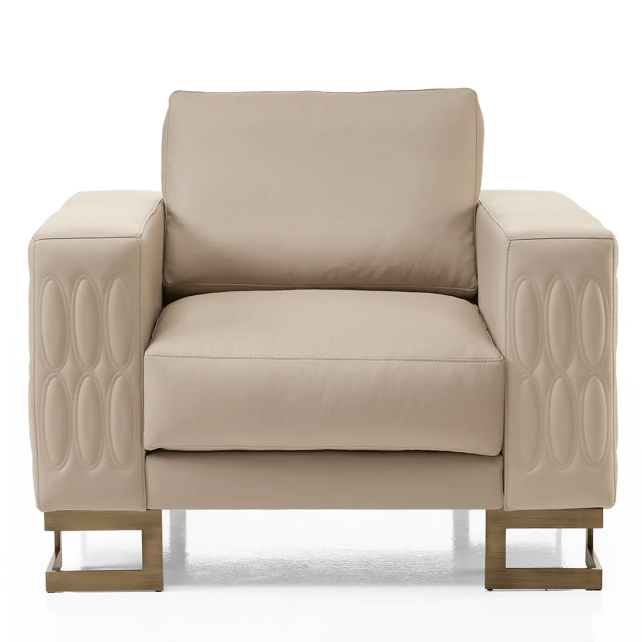 Ispirazioni geometriche diverse convivono armoniosamente in questa sofisticata poltrona lussuosamente rivestita in pregiata pelle beige. Un motivo trapuntato ripetitivo di ovali adorna i fianchi e il cuscino coordinato, una scelta che sottolinea ulteriormente il fascino sartoriale del pezzo. I piedini angolari a forma di profilo rettangolare, rifiniti in bronzo, sostengono egregiamente l’imponente seduta riccamente imbottita.
