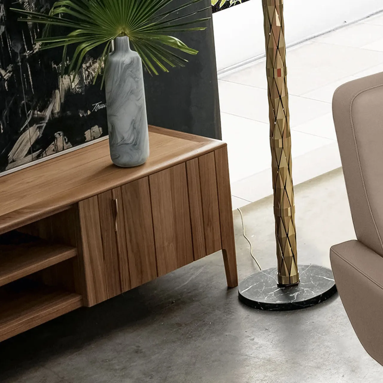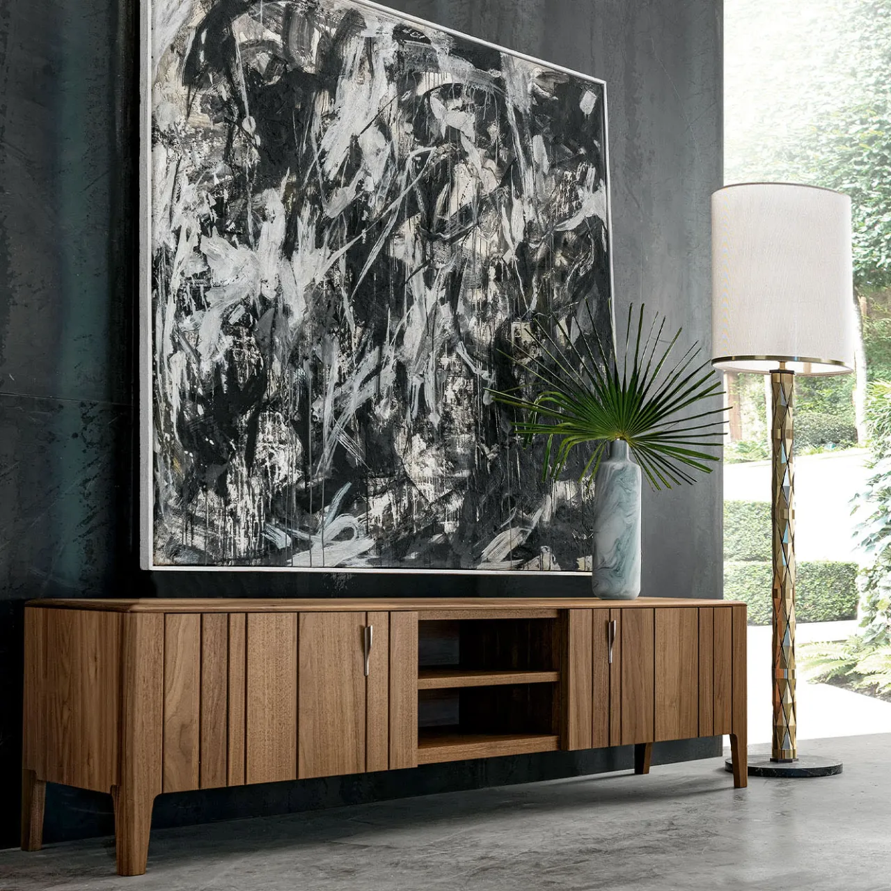 Da una collezione completa di arredi per il soggiorno in caldo noce canaletto, il porta TV Domino è caratterizzato da pannelli verticali che attraversano i suoi mobili. A far risaltare il pezzo è la tinta avana trasparente, che lascia trasparire le venature e le imperfezioni naturali del legno. Su richiesta, il mobile può essere rivestito in marmo.