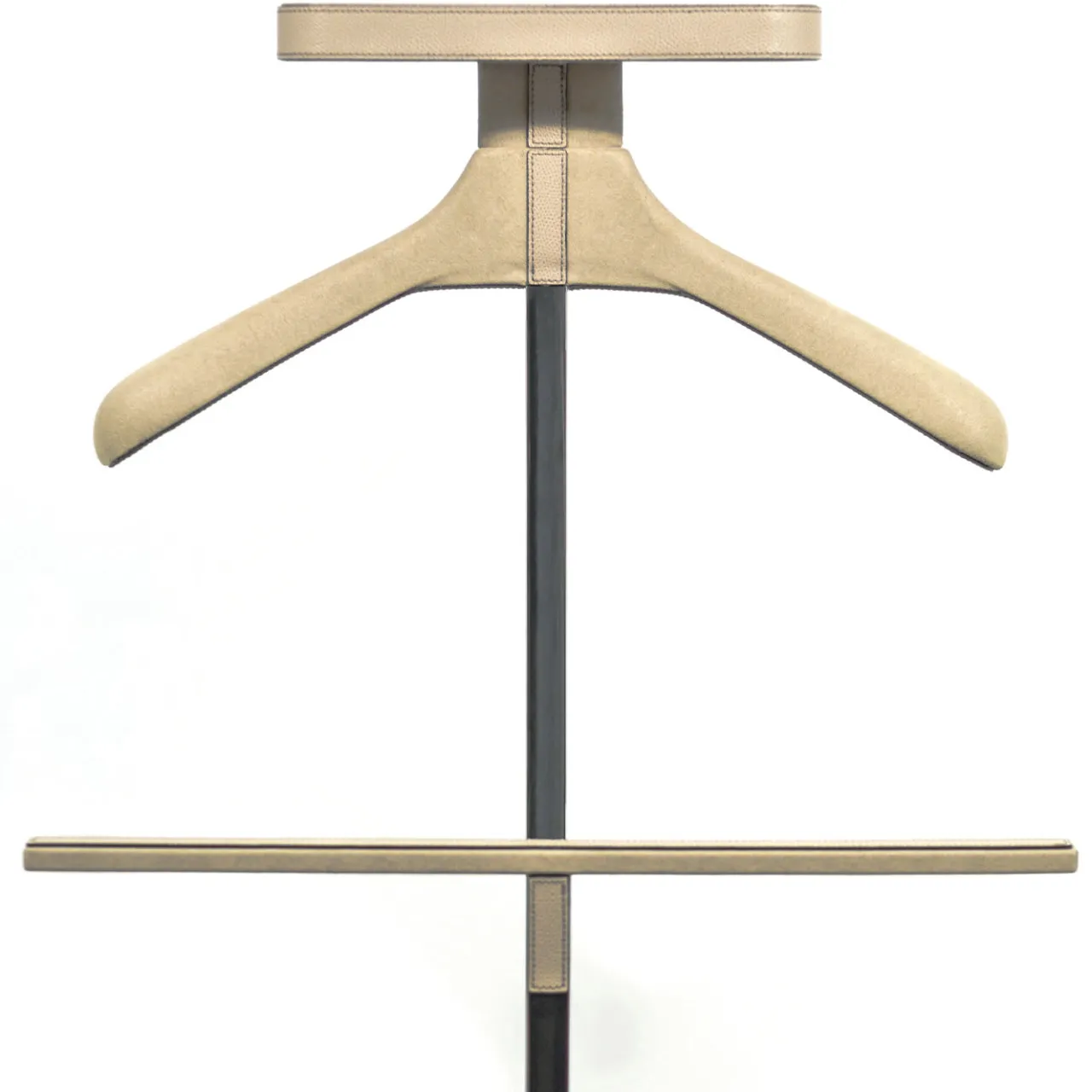 Questo portavalori in acciaio, pelle e microfibra è dotato di appendiabiti, asta per pantaloni e piccolo vassoio per gioielli, perfetto per riporre portafogli, gemelli, chiavi, telefoni e altri oggetti da tasca. I portavalori sono noti per essere superiori agli appendiabiti per la conservazione degli abiti. Disponibile in tutte le pelli e i colori presentati nel catalogo.