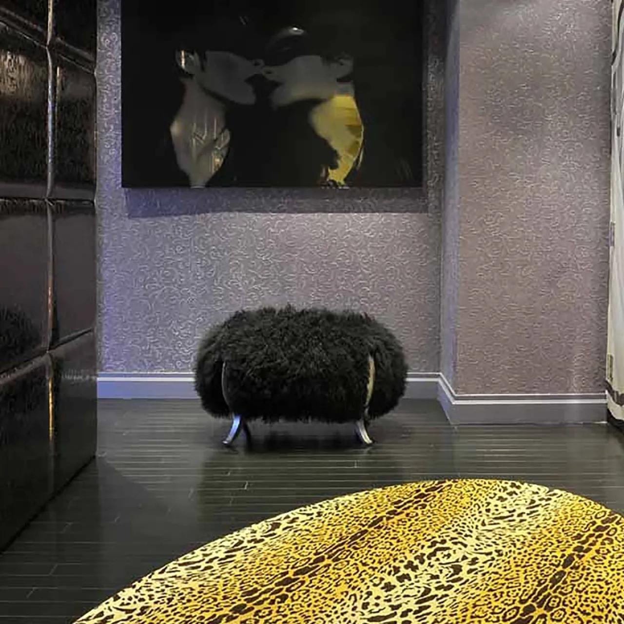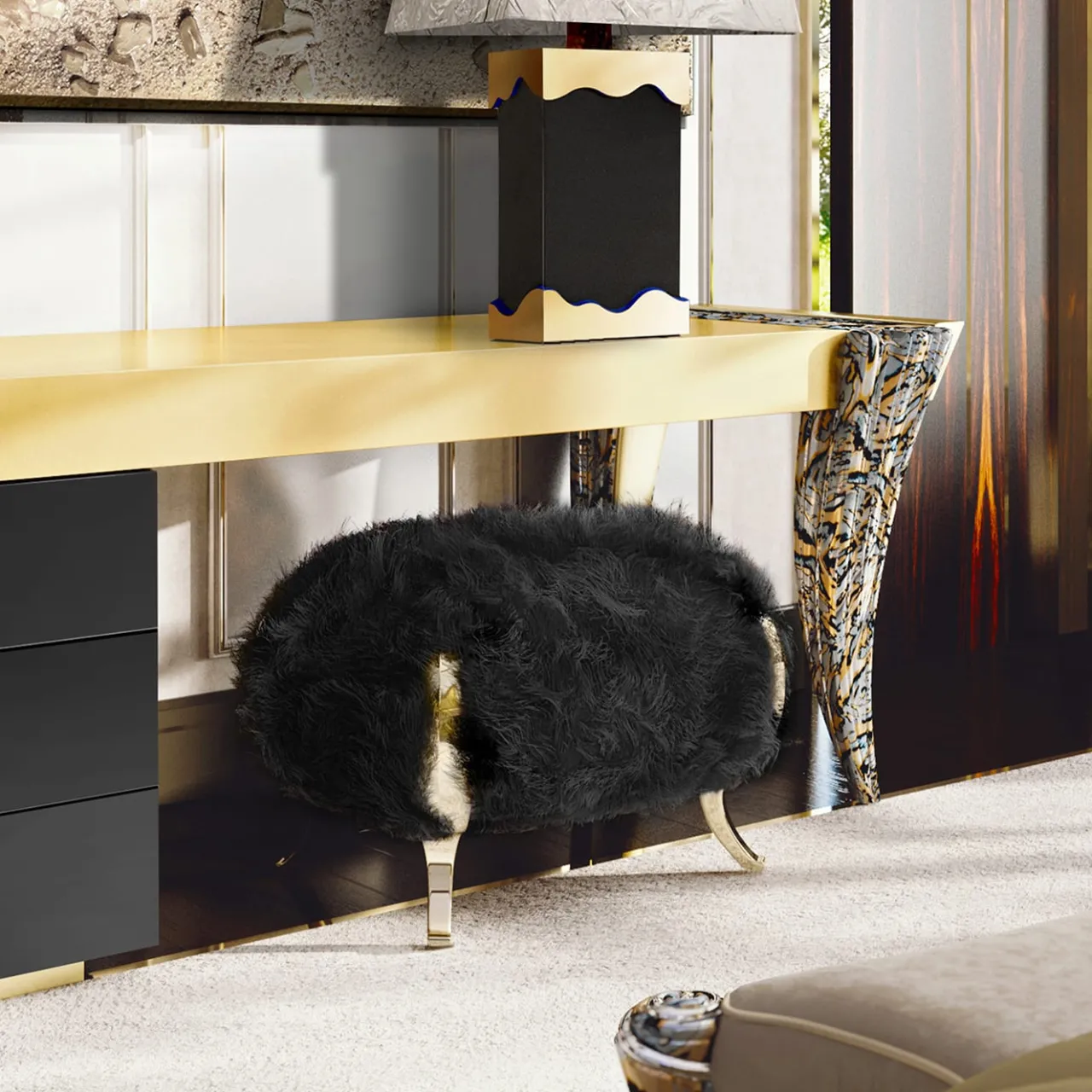 Questo pouf, che fa parte di una serie di pouf unici ed eleganti, è un’ottima aggiunta a una casa moderna o rustica. Può fungere da panca per aggiungere posti a sedere in qualsiasi stanza della casa o essere un comodo poggiapiedi da appoggiare davanti a una poltrona o a un divano. La sua struttura è in bronzo con piedini curvi in finitura scura che si abbina al colore nero della pelliccia di Mongolia che riveste lussuosamente il cuscino. Altri colori disponibili sono il bianco e il marrone, per i dettagli rivolgersi al Concierge. Disegnato da Carlo Rampazzi.