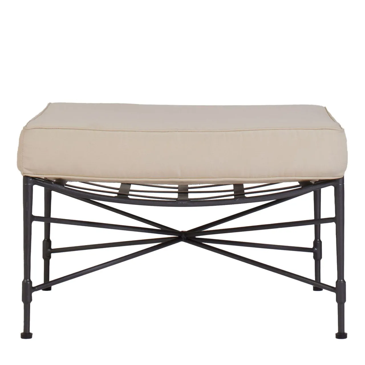 Realizzato magistralmente a mano, questo esclusivo pouf in ferro è un’elegante soluzione per appoggiare i piedi o accogliere un ospite inatteso in terrazza o in veranda. La robusta struttura a intreccio – zincata a caldo e verniciata a fuoco in grigio grafite – è abbinata a un generoso cuscino in tonalità beige – Sunbrella “Canvas” – sfoderabile e resistente all’acqua e alle macchie.