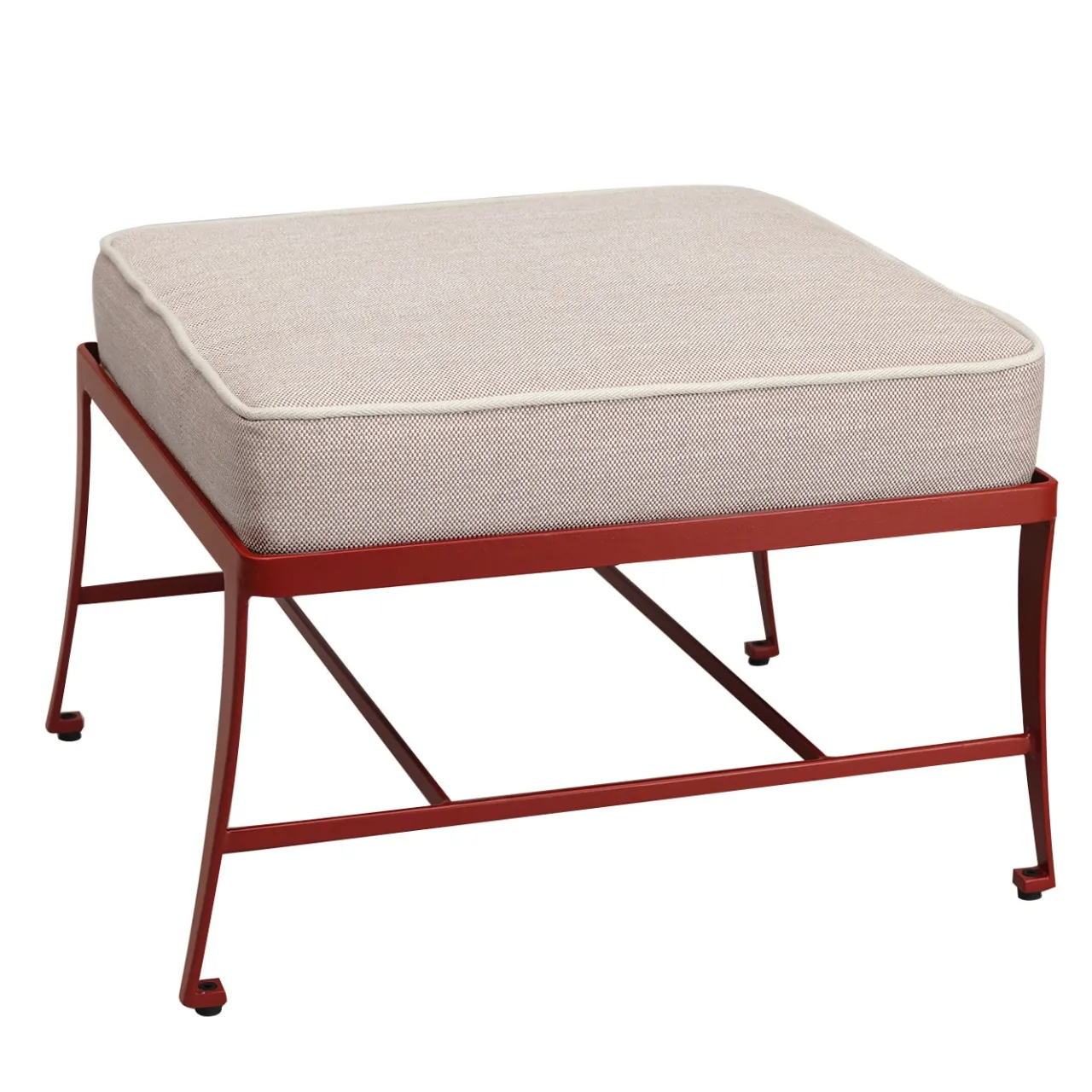 Questo elegante pouf in acciaio zincato, verniciato a polvere e inossidabile è dotato di un cuscino in tessuto rosso adatto all’uso esterno. La base decorativa in tondino crea un pratico ripiano portaoggetti. Questo pezzo rappresenta l’unione tra la tradizione artigianale fiorentina e la ricerca di un design contemporaneo di alto livello.