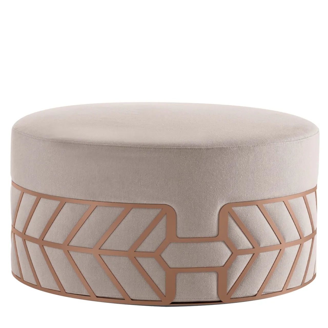 Incarnazione della fusione tra moda e interior design, questo pouf di Elena Salmistraro è caratterizzato da una splendida struttura in acciaio che racchiude il cuscino arrotondato come una cintura attorno a un abito prezioso. Laccata in una tonalità rosa oro, la struttura è delicatamente abbinata al rivestimento in tessuto beige. Imbottito in poliuretano espanso e fibra di poliestere.