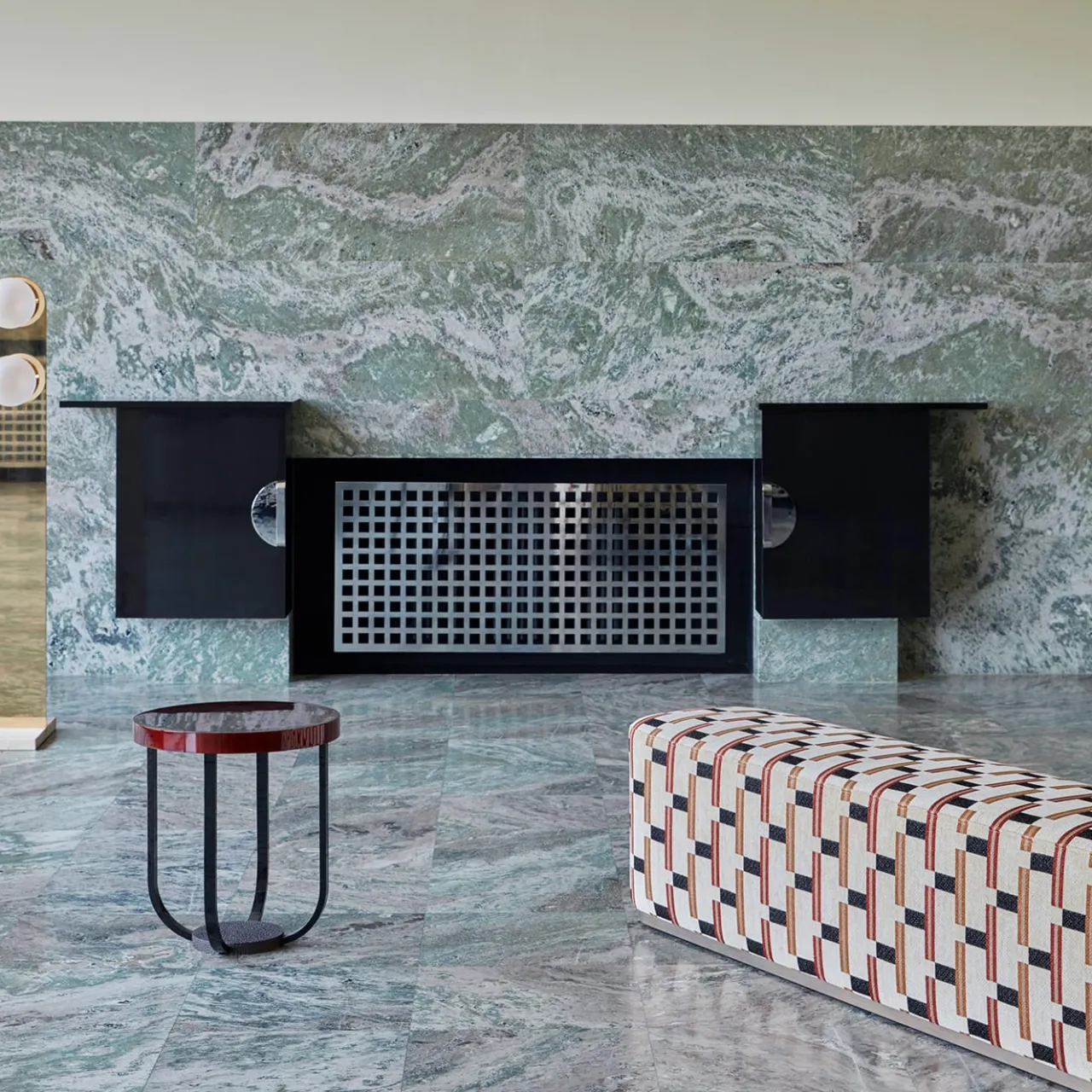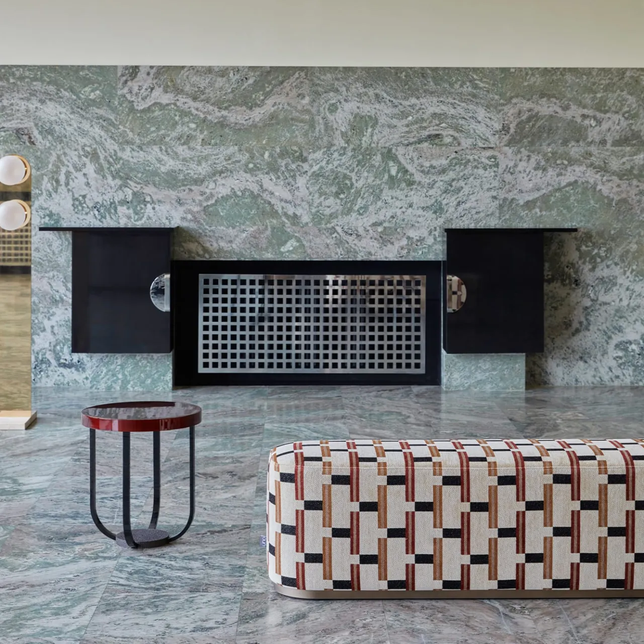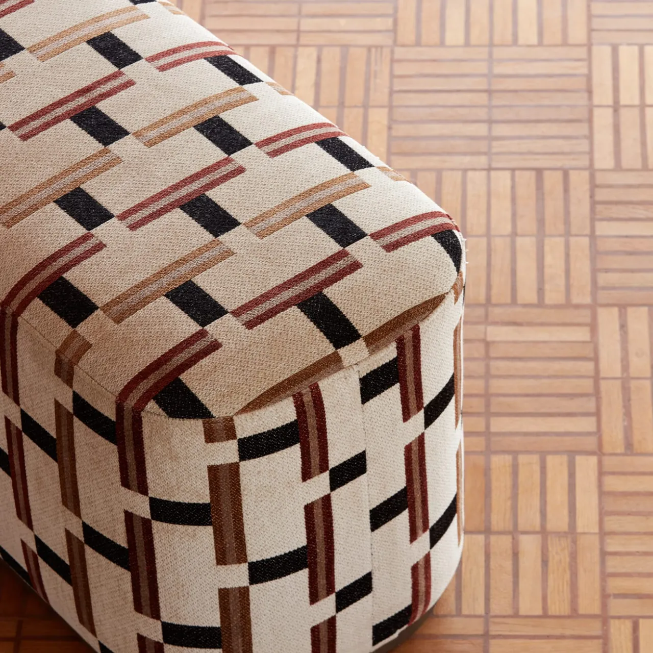 Pouf lungo e di classe, Cassio è rivestito con un tessuto di alta gamma appartenente alla collezione Éléments Terre di Métaphores. Questo jacquard presenta un motivo composto in gran parte da forme rettangolari, ma questa volta disposte in modo da formare un equilibrio finemente calcolato. L’equilibrio è raggiunto non solo nella disposizione dei vari elementi geometrici, ma anche attraverso la morbida gradazione di colori più maschili.