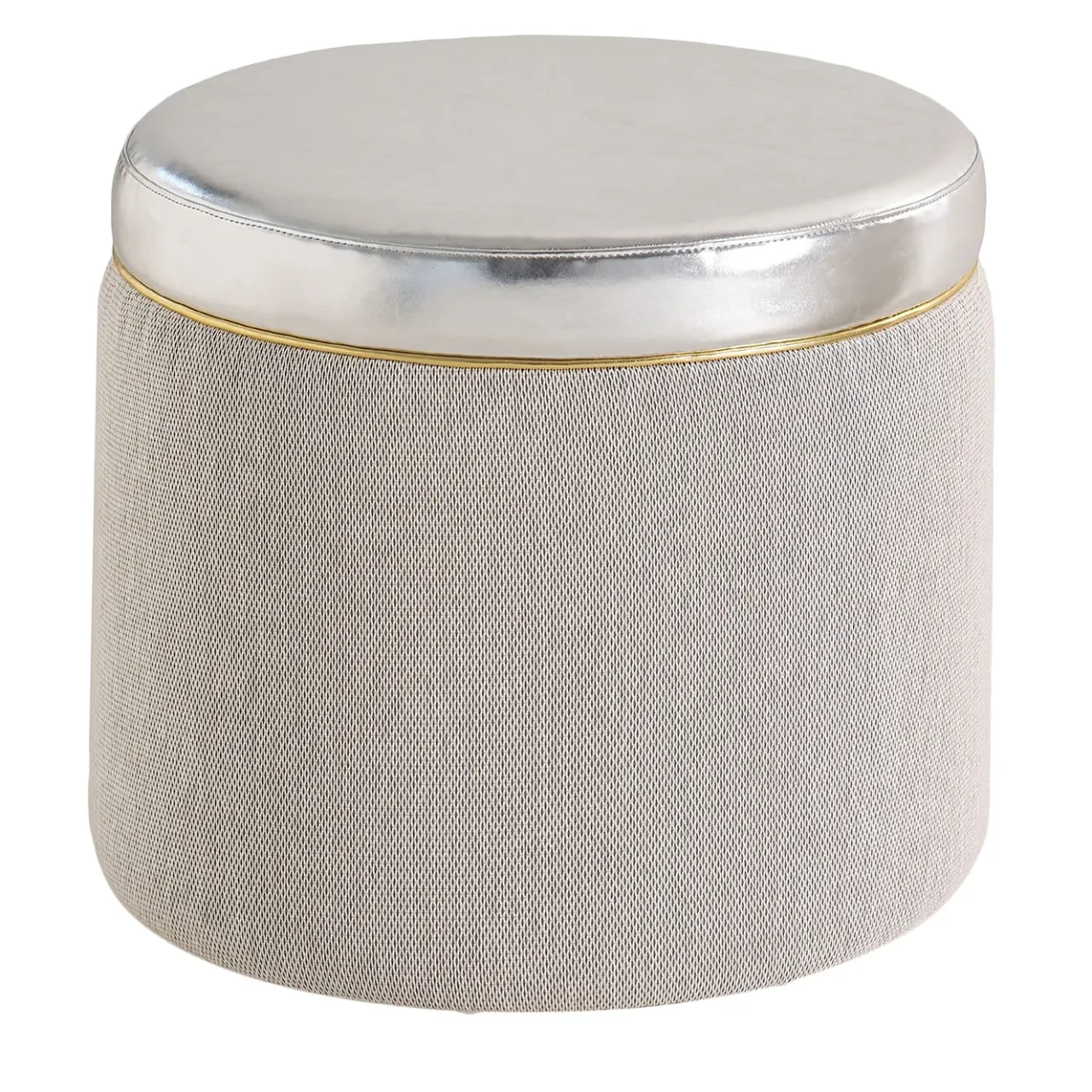 Per appoggiare i piedi o per accogliere un ospite inatteso, questo pouf cattura l’attenzione con il suo design elegante. La tranquilla semplicità di un corpo cilindrico regolare rivestito in tessuto color savana incontra l’audacia di una seduta rotonda rivestita in ecopelle argentata lucida e rifinita con profili dorati tanto sottili quanto scintillanti.
