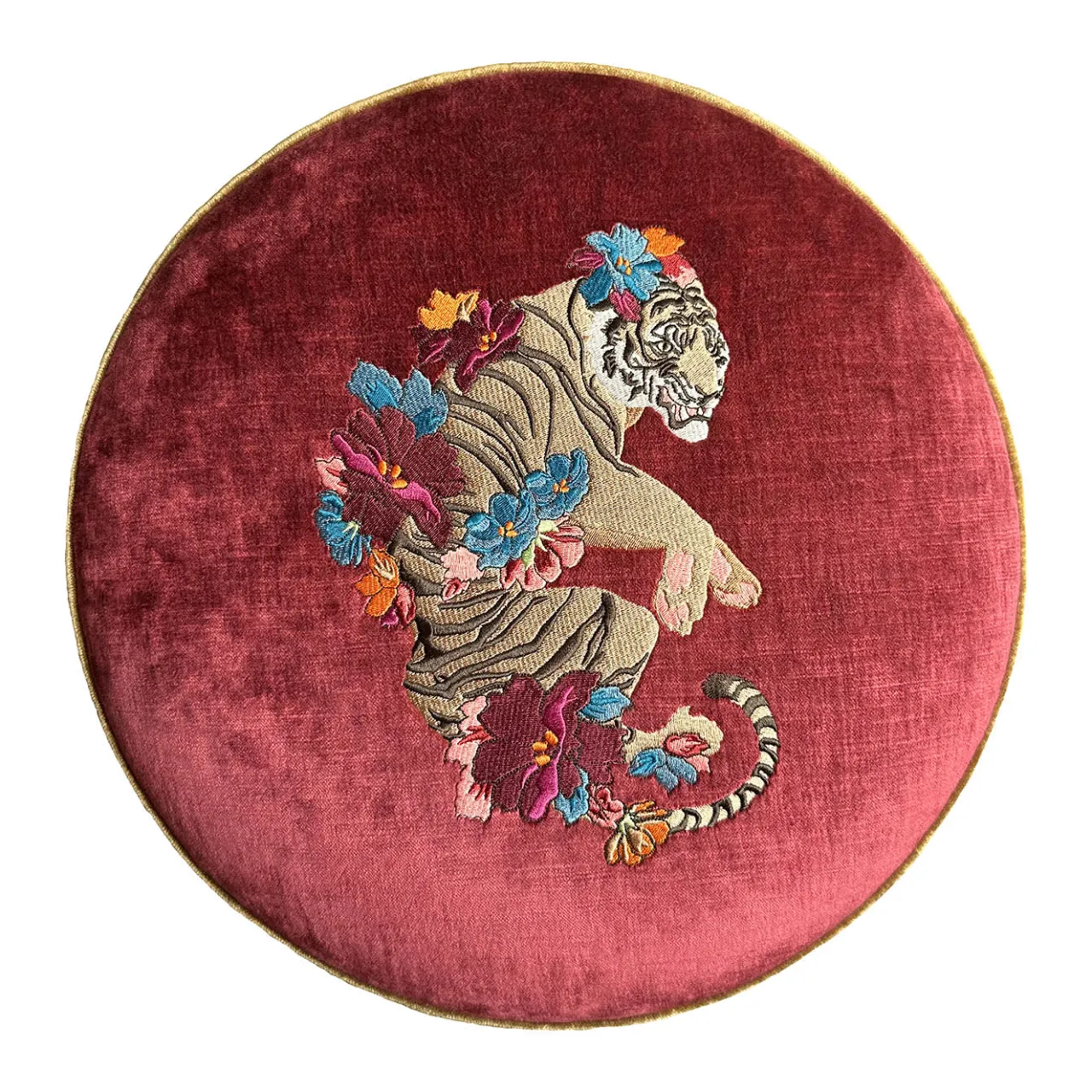 Tanto audace nella combinazione di colori quanto prezioso nel suo valore sartoriale, questo pouf in legno è un pezzo d’arredamento esclusivo che si distingue per il minuzioso ricamo manuale di una tigre punteggiata di fiori colorati che adorna la seduta. Per l’ampia e morbida imbottitura è stata scelta una sapiente combinazione di velluto di cotone e viscosa in un vibrante rosa fragola con accenti di bronzo.