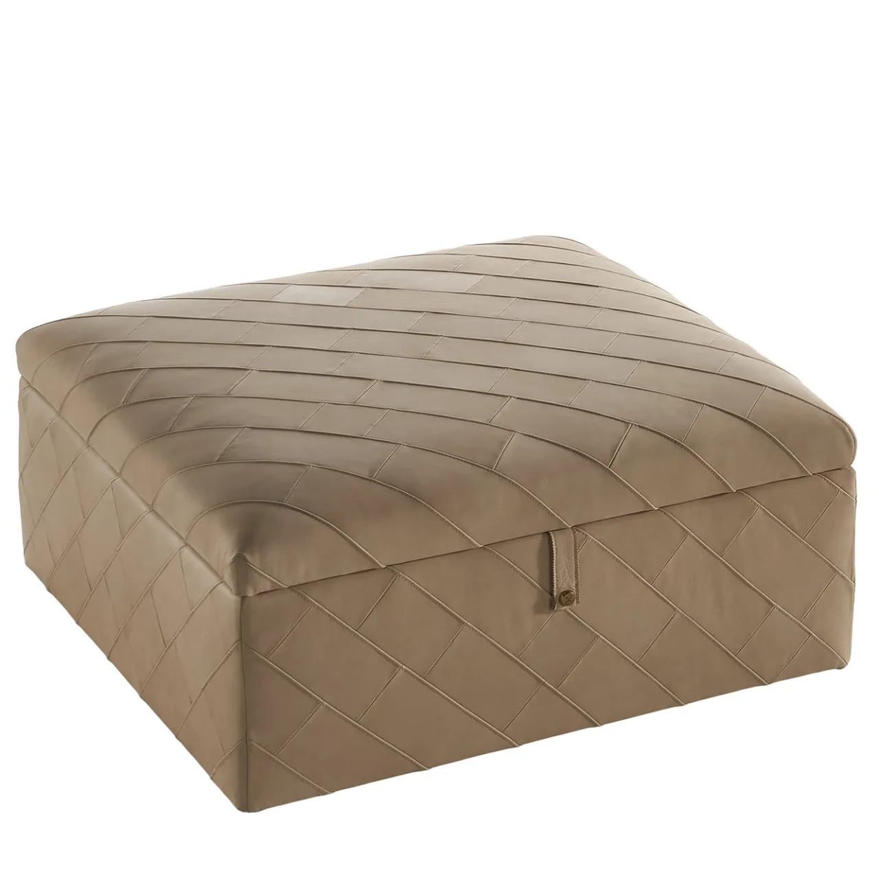 Un raffinato design della serie di pouf e panche della collezione Studio Interior, questo pezzo serve a due scopi, grazie a una forma ergonomica e versatile. Comodo pouf o mobile contenitore, è realizzato a mano in legno massiccio, rivestito in pelle beige di prima qualità e arricchito da un bottone e da un logo in ottone, che riflettono sia lo stile che l’artigianalità del suo design.