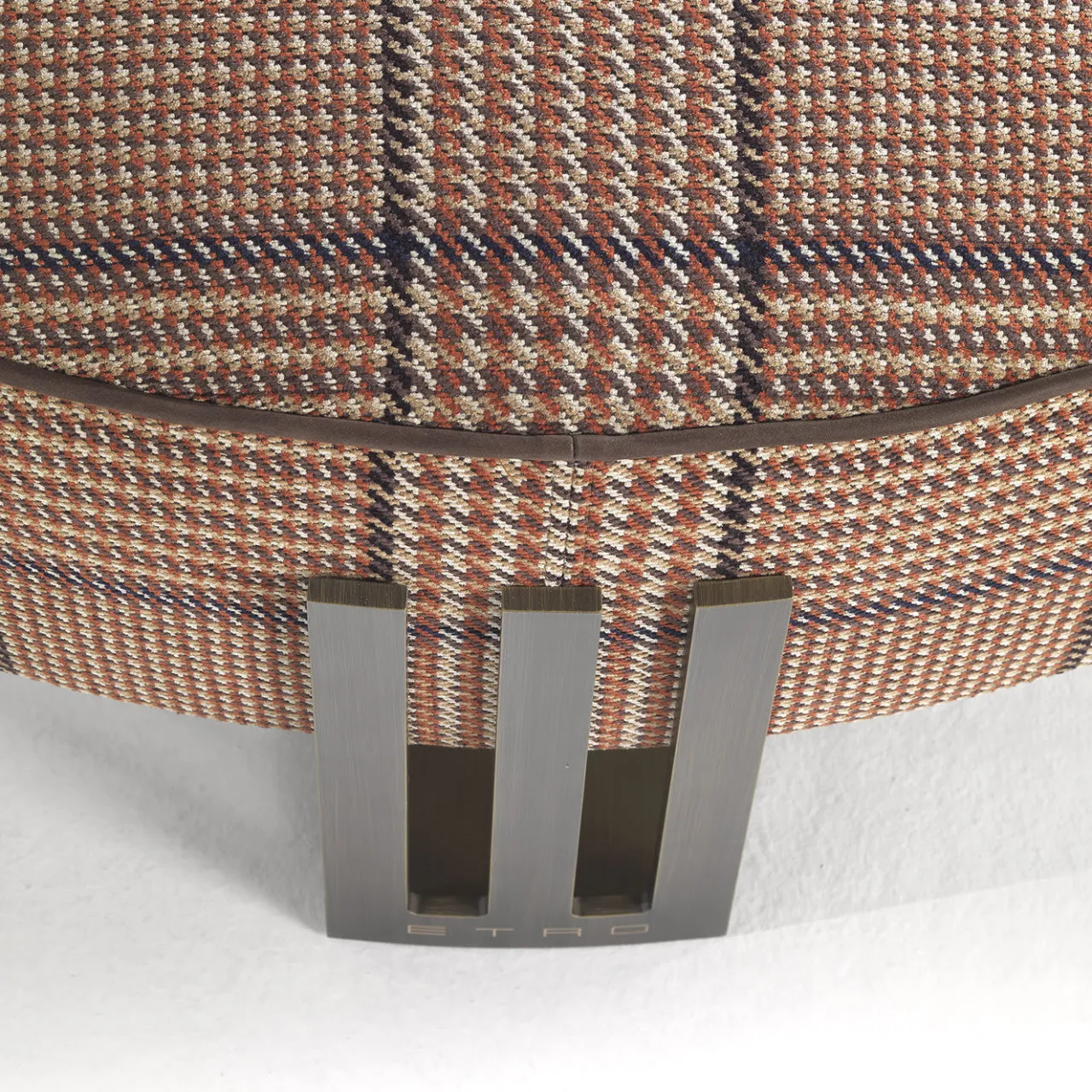 Versatile e compatto, il pouf Klee è un superbo mix di elementi in perfetto stile Etro Home Interiors. Il rivestimento in tessuti tipici della collezione, unito alla raffinatezza della struttura in metallo con la forma ispirata al logo di Etro, contribuisce a esprimere lo spirito poliedrico del marchio. Struttura in metallo patinato bronzo. Seduta in legno e schiuma. Rivestimento in tessuto cat. B Nanmor col. 1 Nomad con profili in pelle cat. A Nuuk col. 1 Brown. Si prega di verificare le opzioni disponibili con il Concierge.