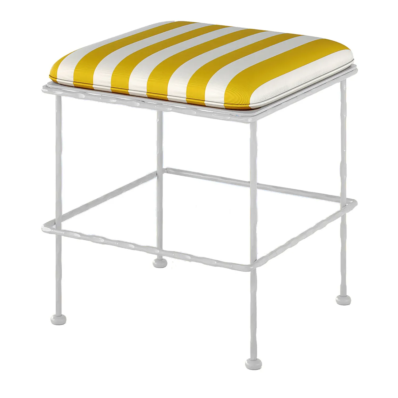 Il pouf Liberty presenta una struttura slanciata in ferro bianco che riflette la raffinata tradizione della lavorazione del ferro battuto, combinata a un design contemporaneo e lineare. Le sue dimensioni compatte lo rendono un’opzione versatile per i contesti esterni. Il pouf è fornito di un sedile imbottito rivestito in un tessuto a righe bianche e gialle della categoria C, che aggiunge un tocco fresco e vivace. Questo elegante pouf bilancia funzionalità e stile senza tempo.